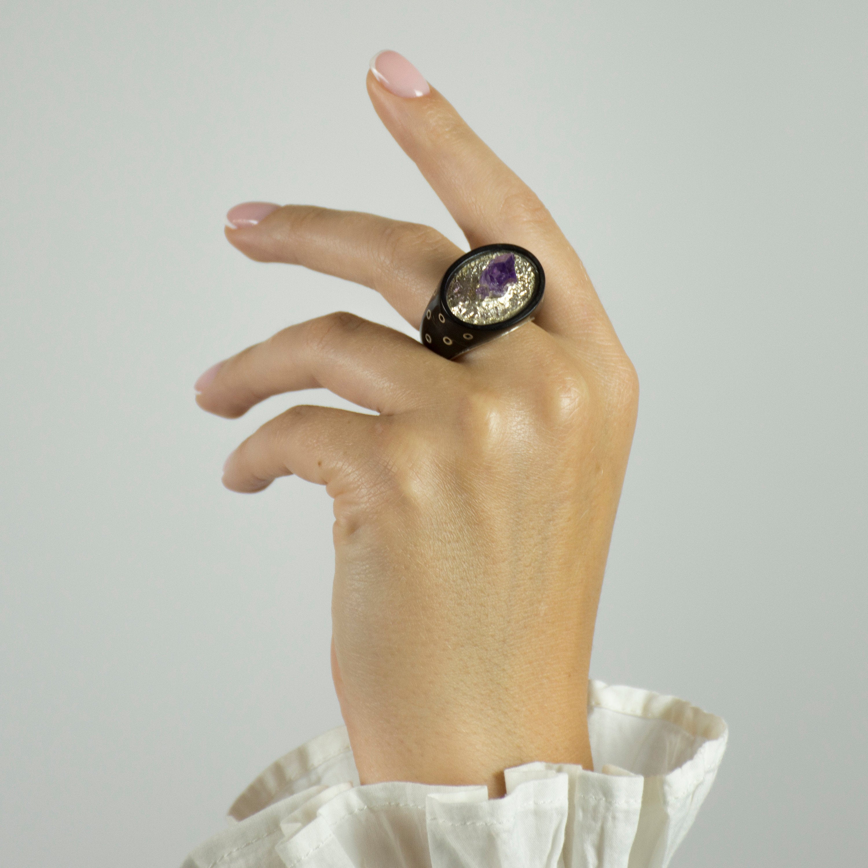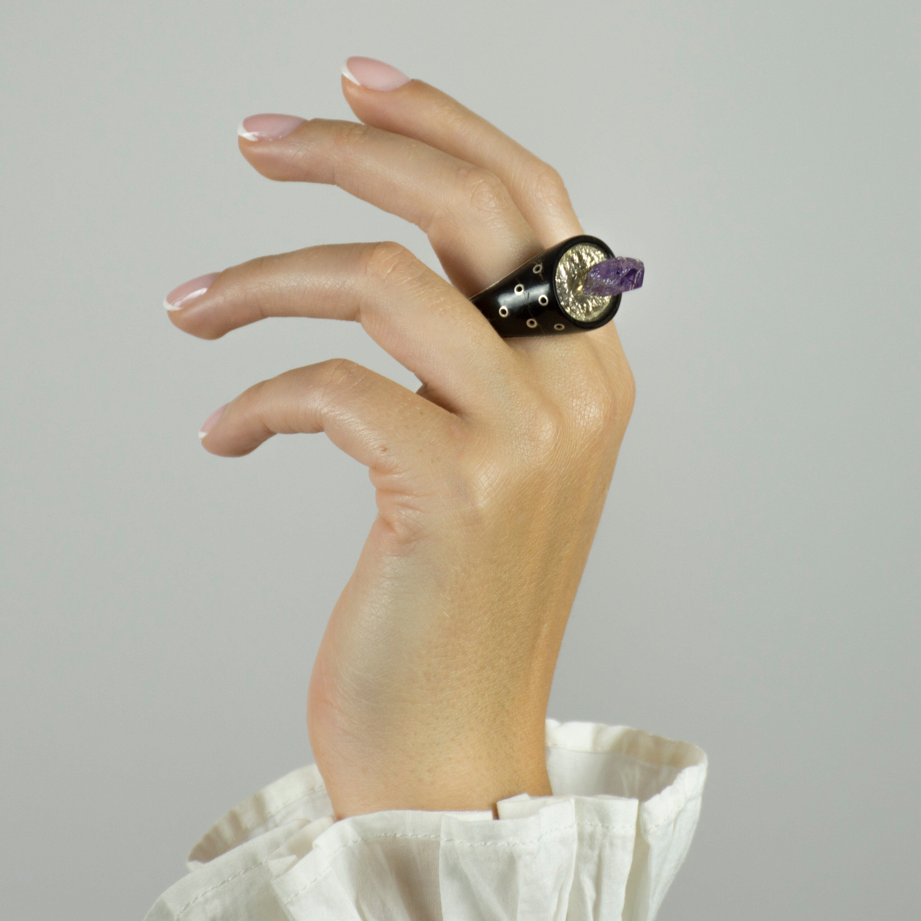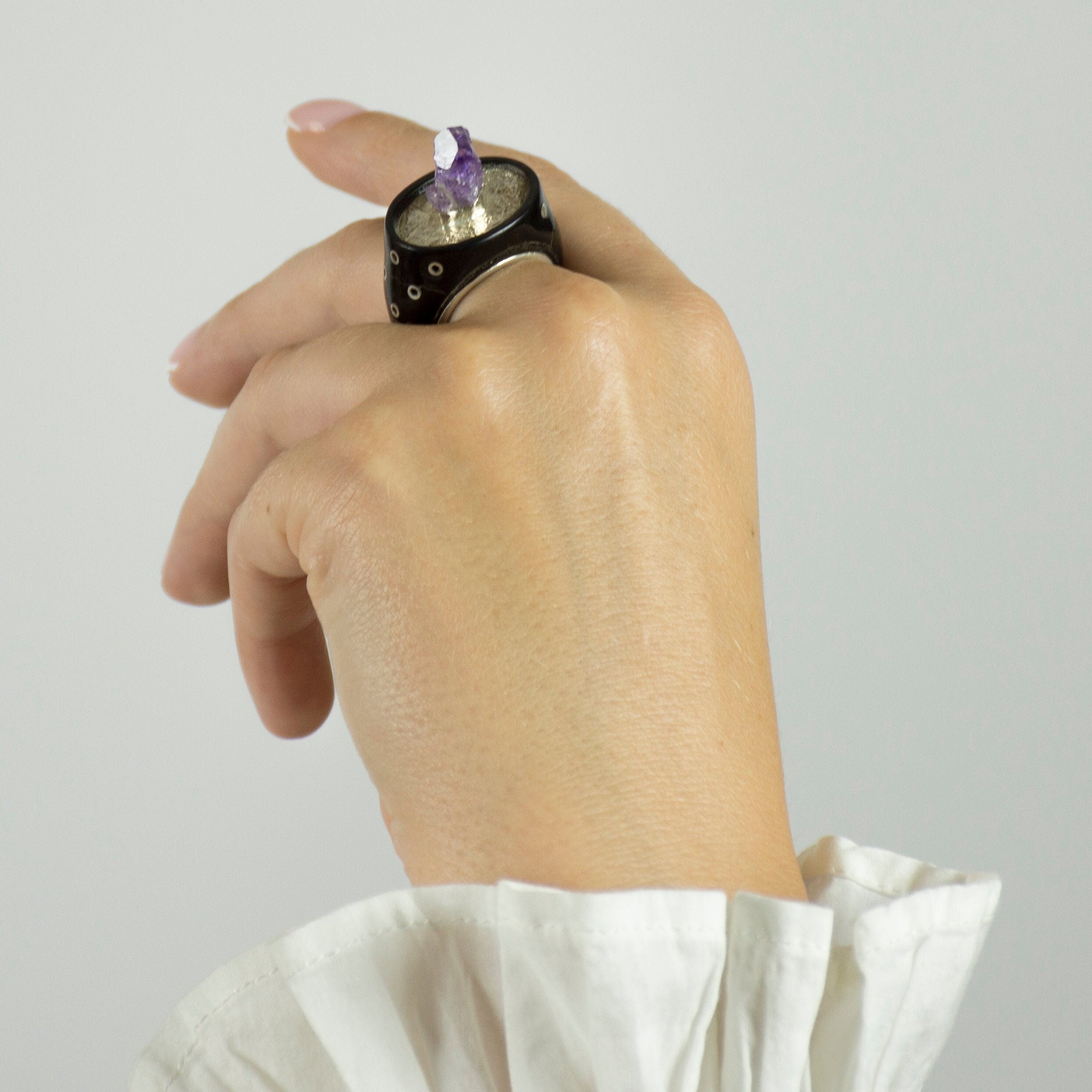 The Multi-gemstone ring is a stunning piece of jewelry that combines natural materials with exquisite craftsmanship. This exclusive handmade ring is designed for those who appreciate unique and artistic expressions of style. Made from bull horns and 925 sterling silver, this ring is not just an accessory; it is a statement piece that showcases your individuality and impeccable taste.