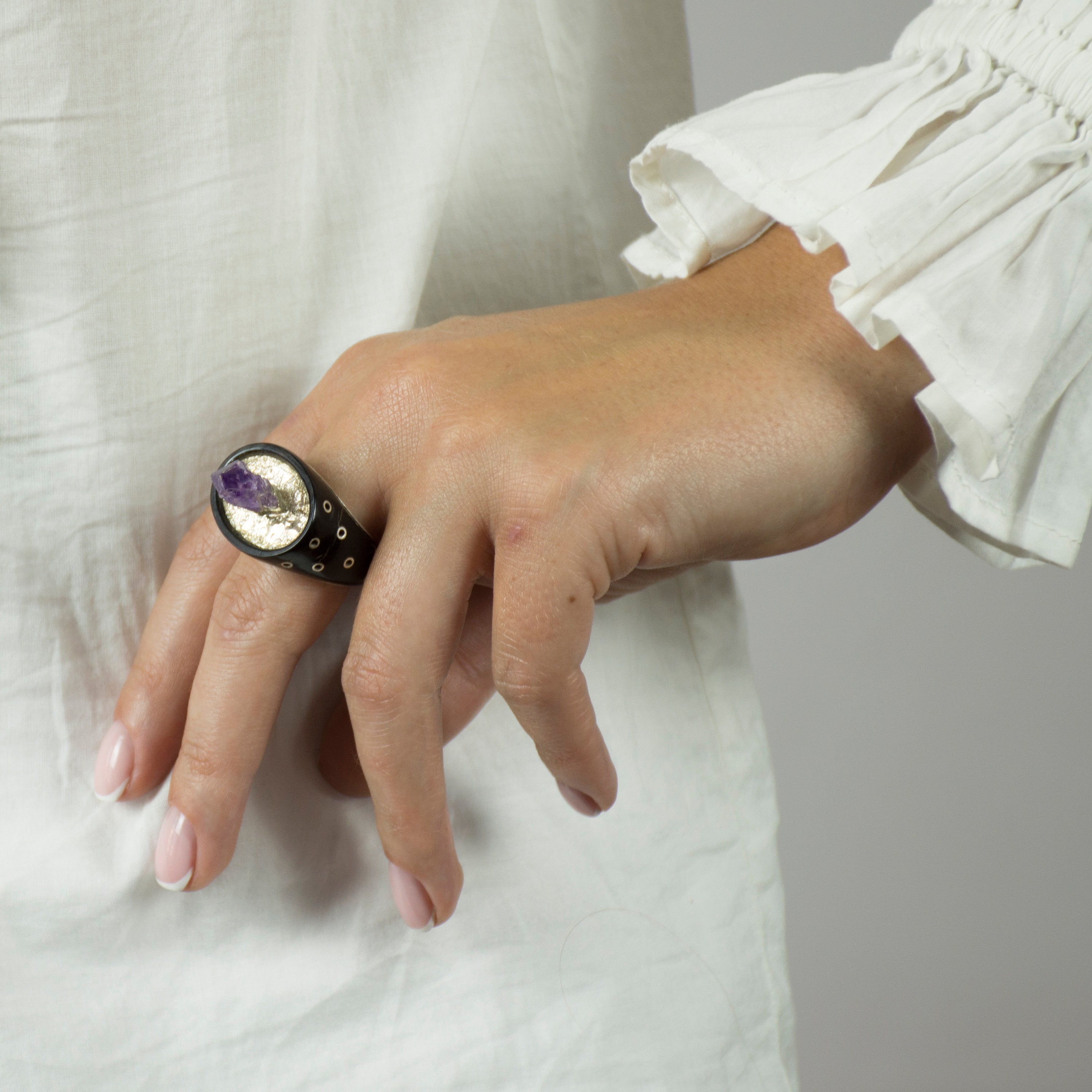The ring features a beautiful amethyst stone, known for its rich purple hue and spiritual significance. Amethyst is often associated with tranquility, balance, and peace, making it a perfect choice for those who seek harmony in their lives. The stone is securely fixed in place, resembling a majestic mountain that towers into the heavens, symbolizing strength and stability.