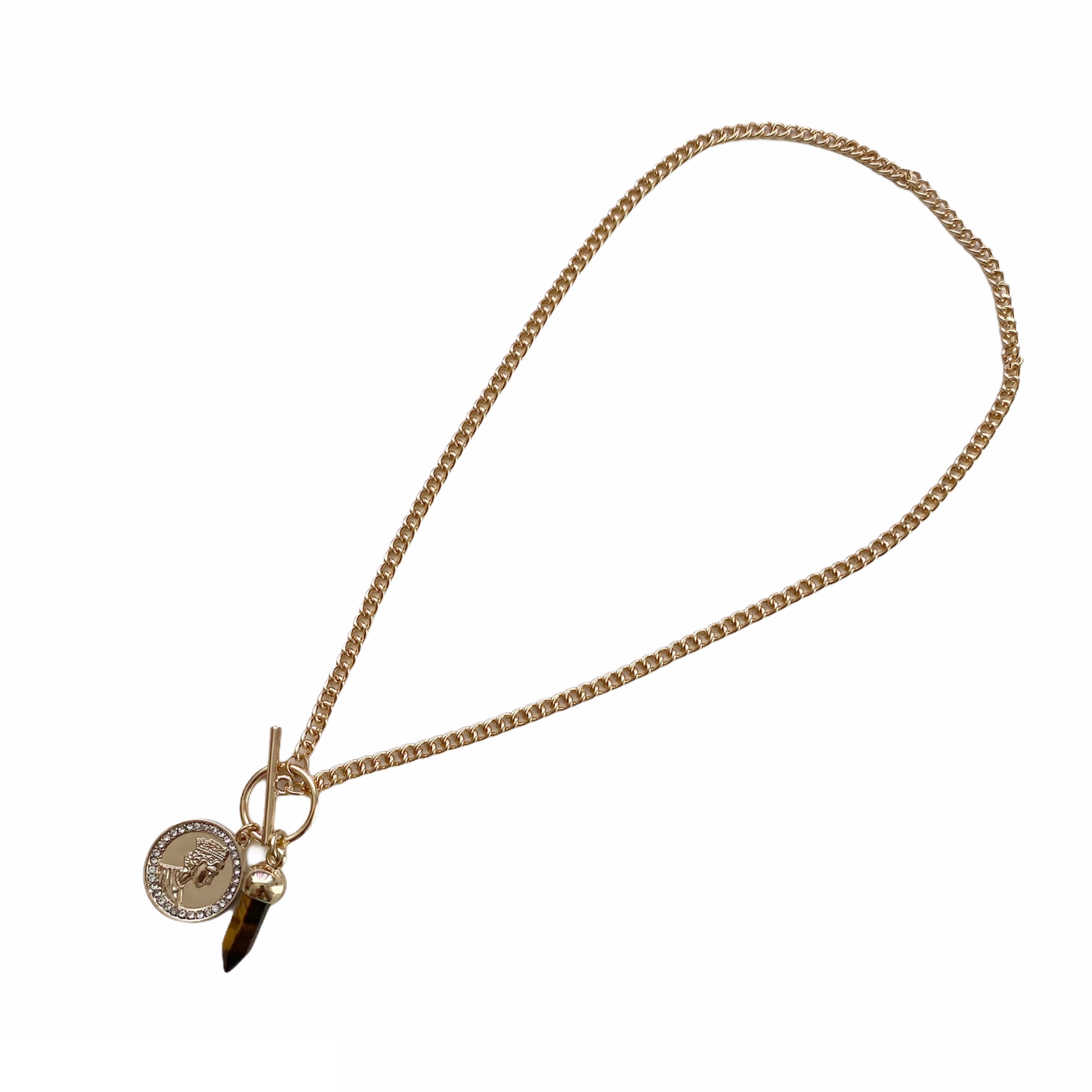 This exquisite necklace features a striking coin charm that is beautifully surrounded by sparkling zirconia stones, adding a touch of glamour. The centerpiece of the necklace is a captivating tiger's eye point charm, known for its unique banding and rich golden-brown hues. The combination of these elements creates a piece that is not only visually appealing but also meaningful.