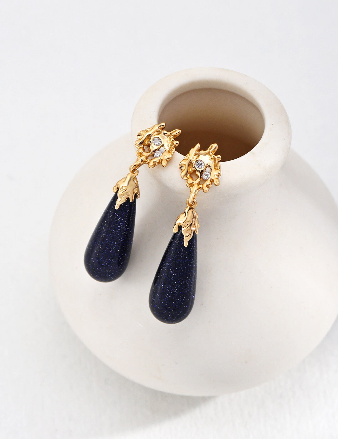 Each pair of Night Sky Blue Sandstone Earrings is meticulously crafted by skilled artisans. The blue sandstone used in these earrings is known for its deep, celestial hue, reminiscent of a starry night sky. The zircon stones add a touch of sparkle, enhancing the overall aesthetic of the earrings. The gold vermeil finish not only provides a luxurious look but also ensures durability, making these earrings a long-lasting addition to your jewelry collection.