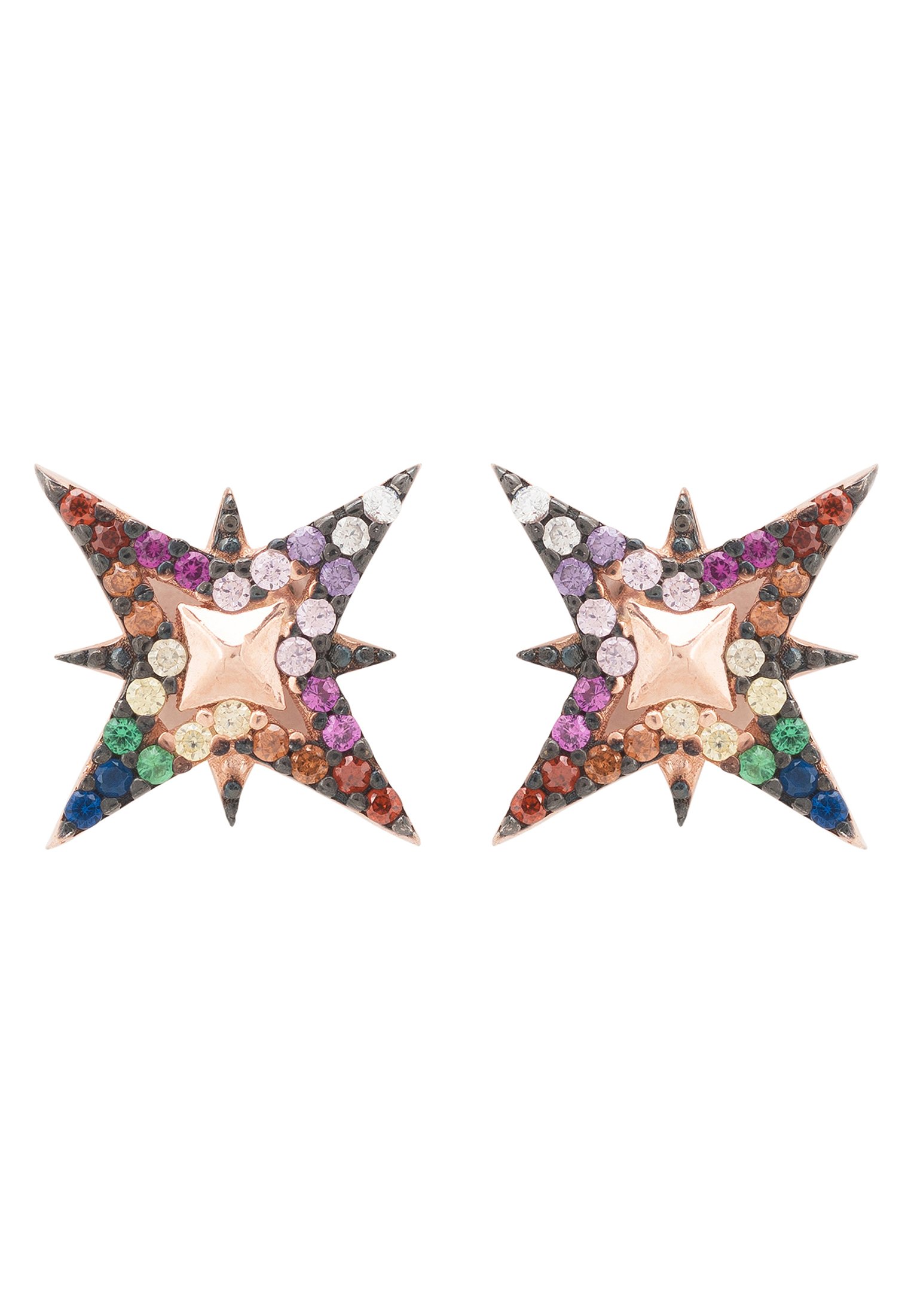 Introducing the North Star Rainbow Stud Earrings in stunning rosegold, a perfect accessory for those who love to shine. These earrings are designed to resemble the brightest star in the constellation, making them a standout piece in any jewelry collection. The vibrant rainbow-colored zircons are beautifully set around a delicate metallic north star at the center, adding a touch of glitz and glam to any outfit.