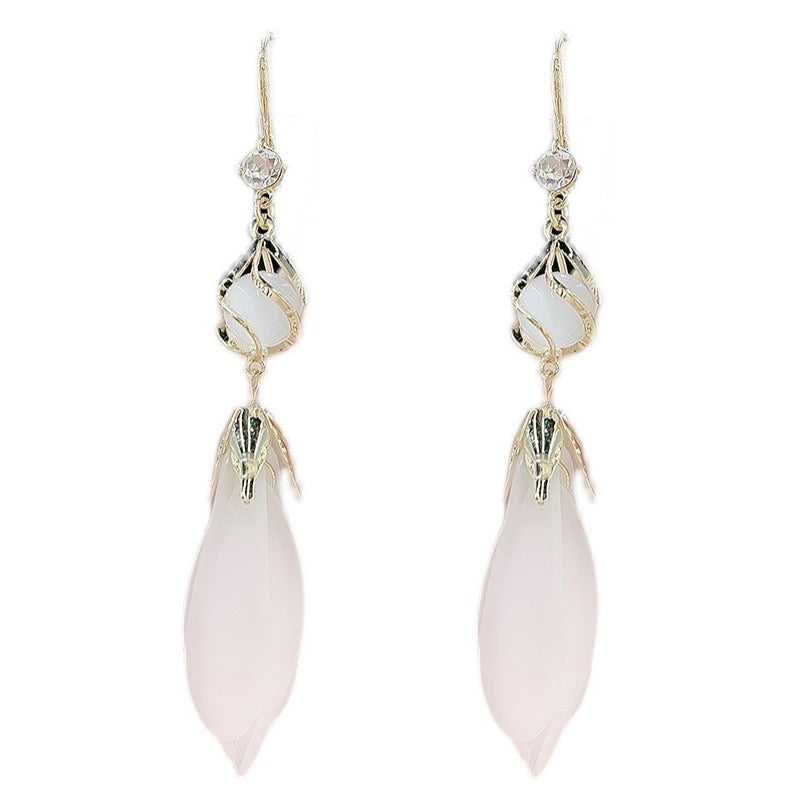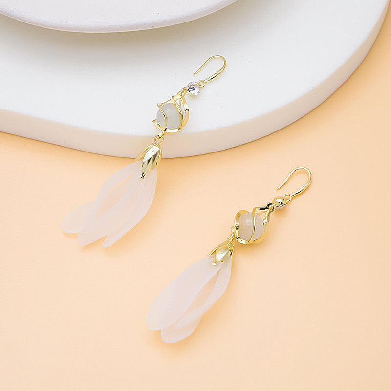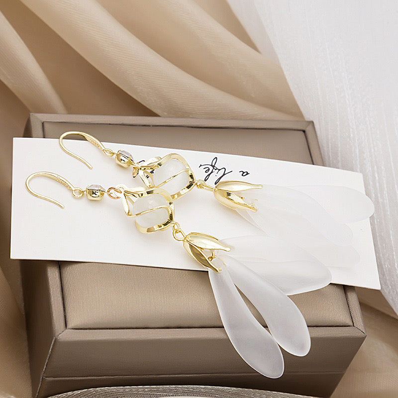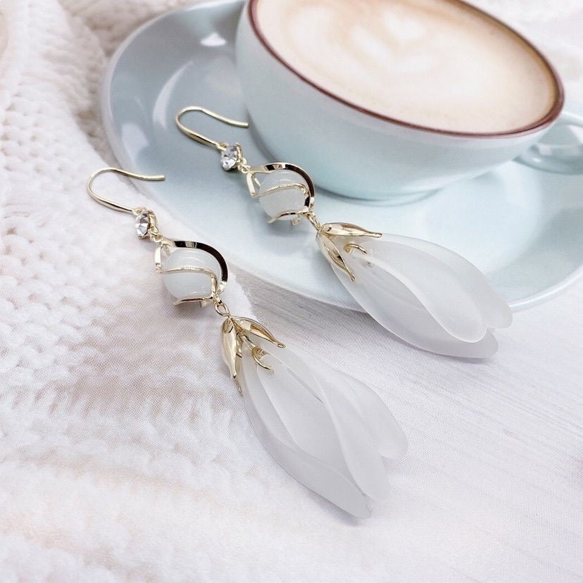 Introducing our exquisite Opal White Flower Petals Earrings, a stunning accessory that embodies elegance and sophistication. Crafted with high-quality materials, these earrings are designed to enhance your beauty and complement any outfit. The unique flower petal design features opal, alloy, rhinestone, and acrylic elements, making them a perfect choice for both casual and formal occasions.