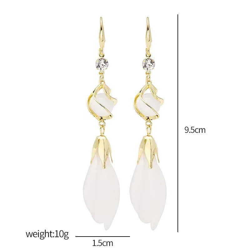 The Opal White Flower Petals Earrings measure 9.5 cm in length and 1.5 cm in width, making them the perfect size to make a statement without being overwhelming. Weighing only 10 grams, these earrings are lightweight and comfortable to wear throughout the day, whether you're at work, attending a special event, or enjoying a night out.
