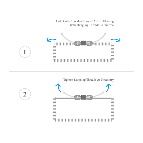 This bracelet is one size fits all, with the drawstring able to extend or tighten to suit your wrist size. To take the bracelet on or off your wrist, simply slide the bracelet over your hand after widening the two sides of the bracelet apart and tighten as necessary using the two dangling threads. Less is More.