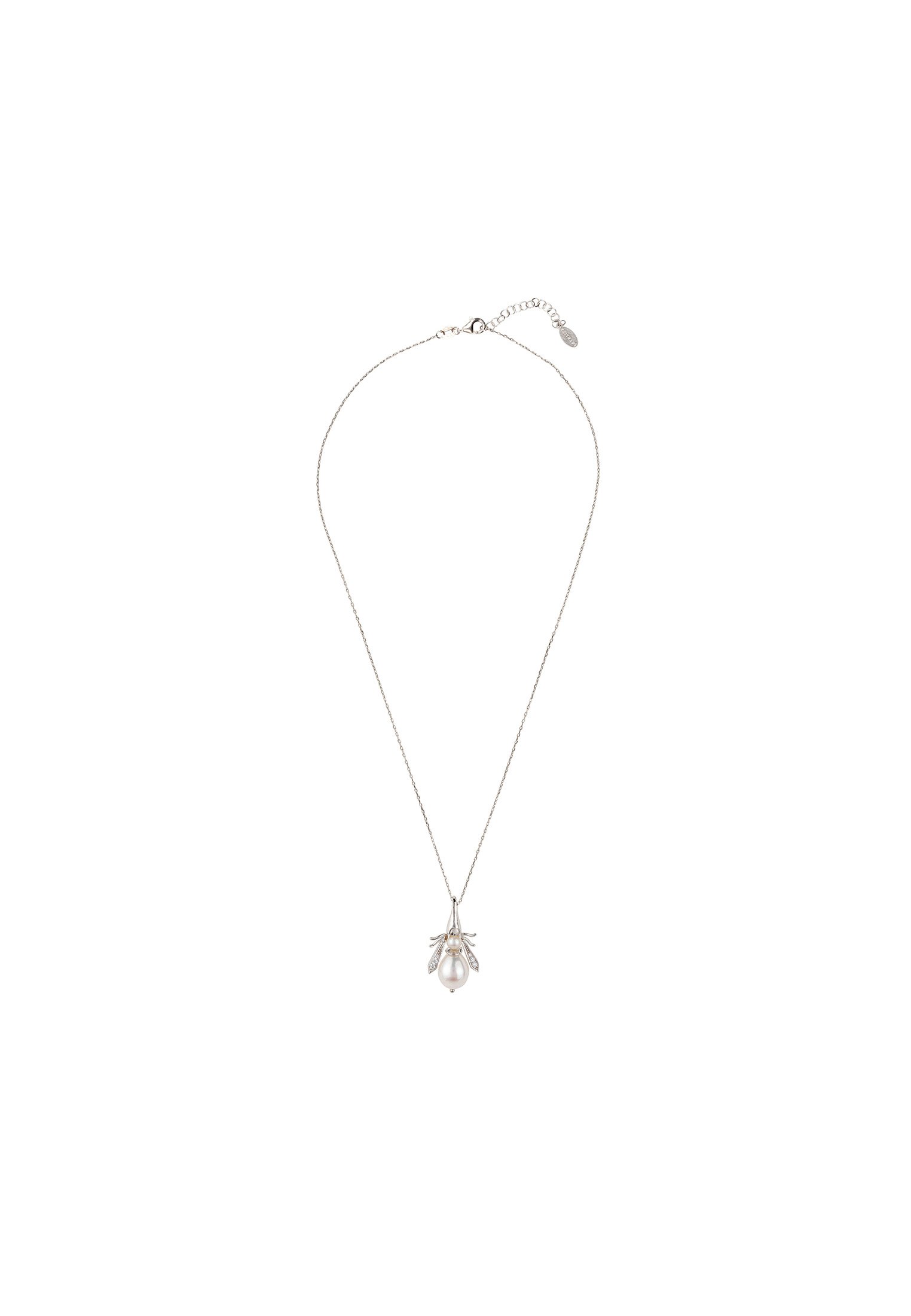 A delicate silver necklace featuring a pearl gemstone bee pendant, symbolizing wisdom and purity.