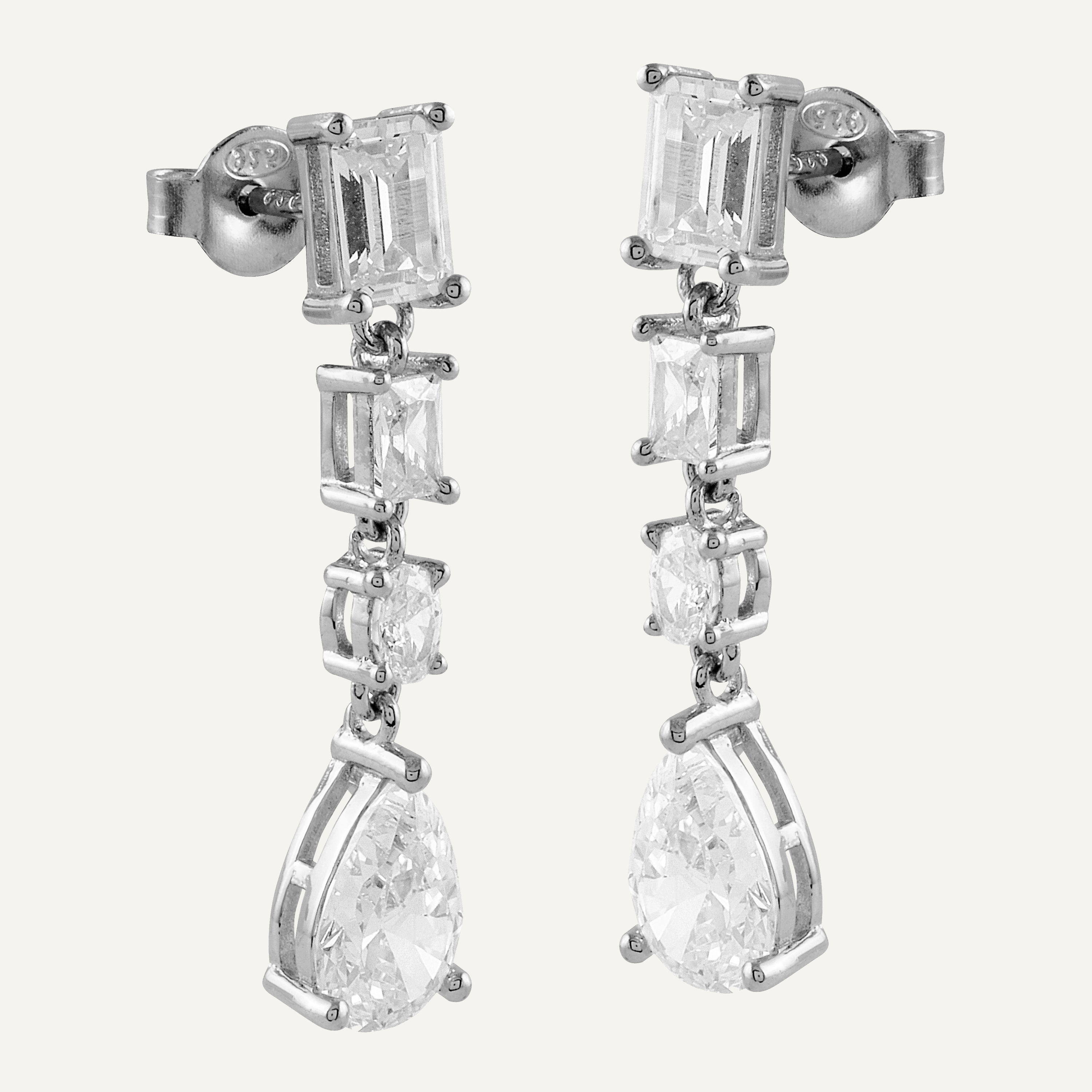 Pendientes largos de plata con circonitas blancas en forma de lágrima, brillantes y elegantes.