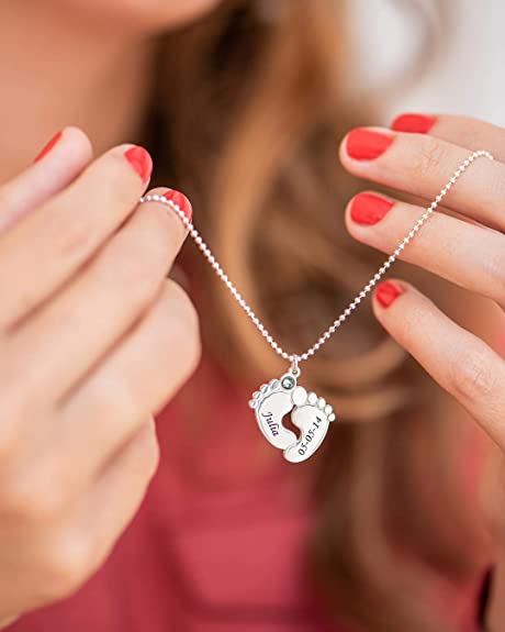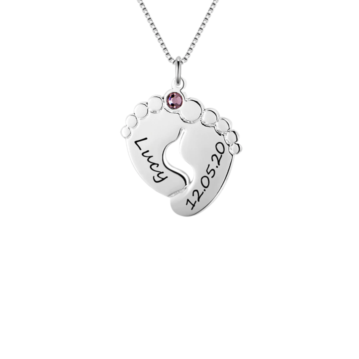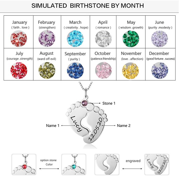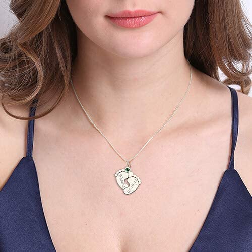 What sets this necklace apart is its unique personalization options. You can engrave two names on the baby feet, making it a truly special keepsake. Whether it's your child's name or a loved one's, this customization adds a personal touch that makes the necklace even more meaningful. Additionally, you have the option to choose a birthstone to complement the design, adding a splash of color and significance to the piece.