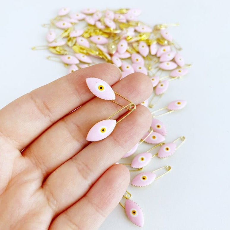 Crafted from high-quality brass, our evil eye safety pins are designed to last. Each pin features a charming pink evil eye charm, measuring 8mm, which is believed to ward off negative energy and bring good luck to the wearer. The total length of the safety pin is 25mm, making it a perfect size for attaching to clothing, bags, or as part of a decorative arrangement.