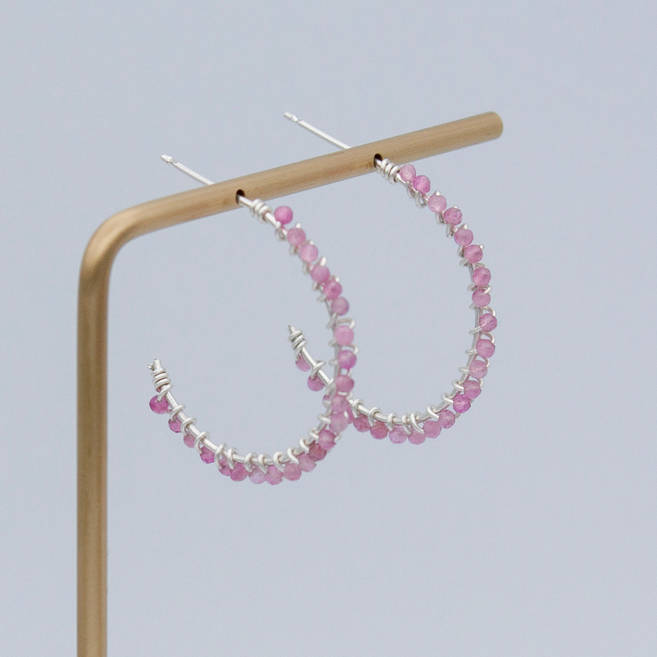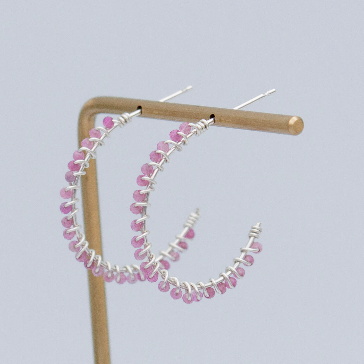Introducing our exquisite Pink Tourmaline Beaded Sterling Silver Hoop Earrings, a stunning accessory that combines elegance and style. These earrings feature a beautiful arrangement of 2mm pink tourmaline beads, which add a touch of color and sophistication to any outfit. The delicate hoop design, with a diameter of 1 inch, makes them perfect for both casual and formal occasions.