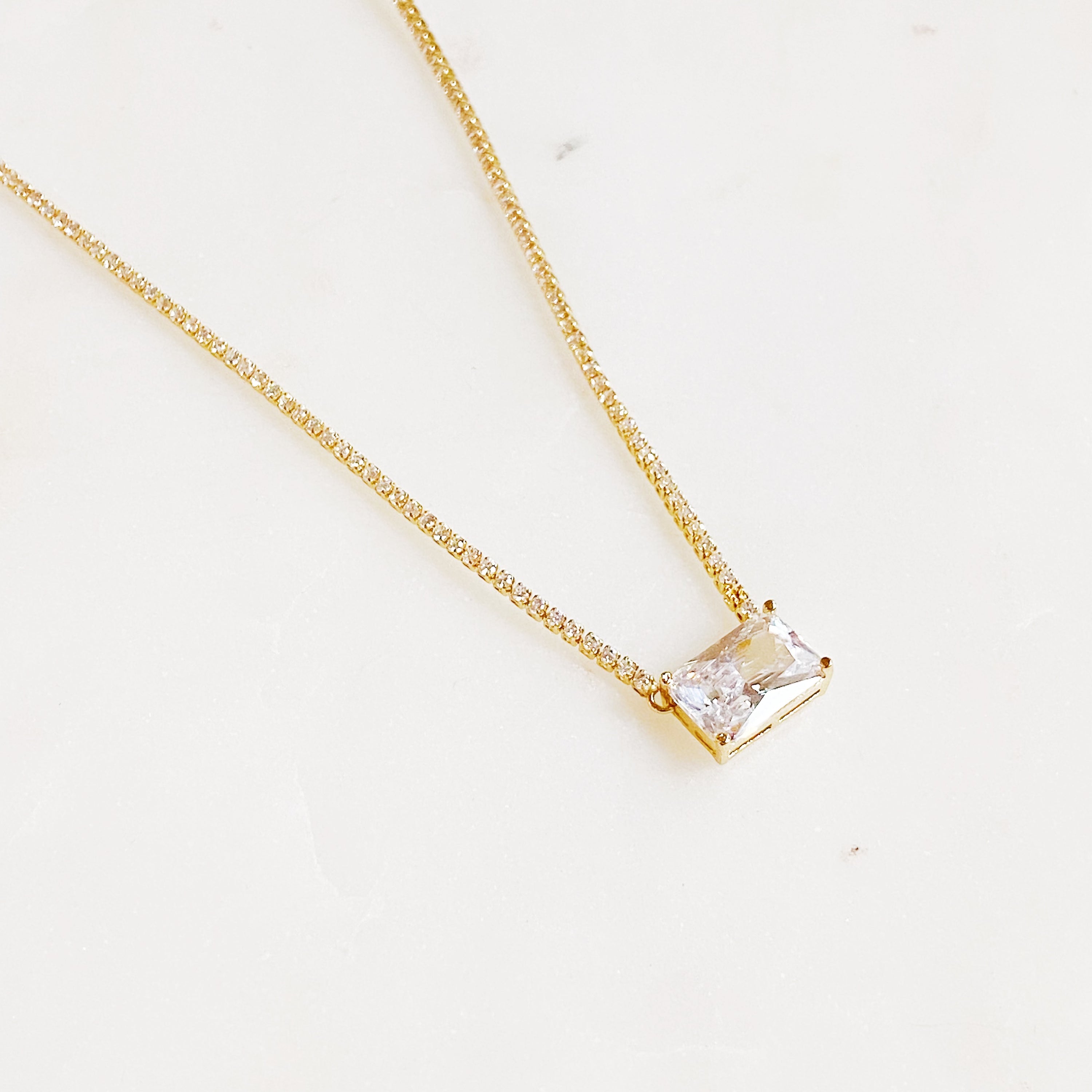 A stunning emerald cut pendant tennis necklace featuring gold-plated brass and sparkling cubic zirconia stones, perfect for elegant occasions.