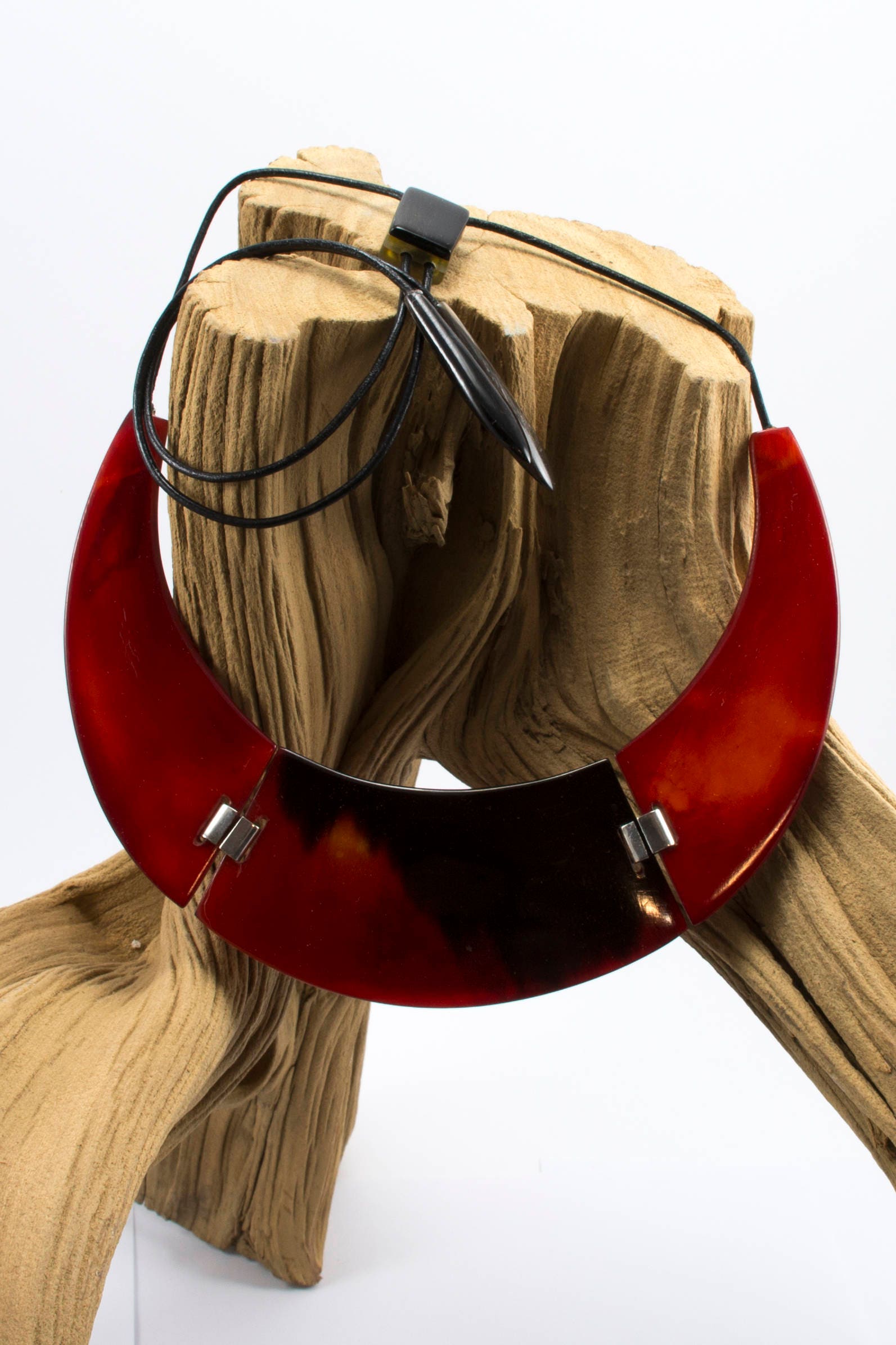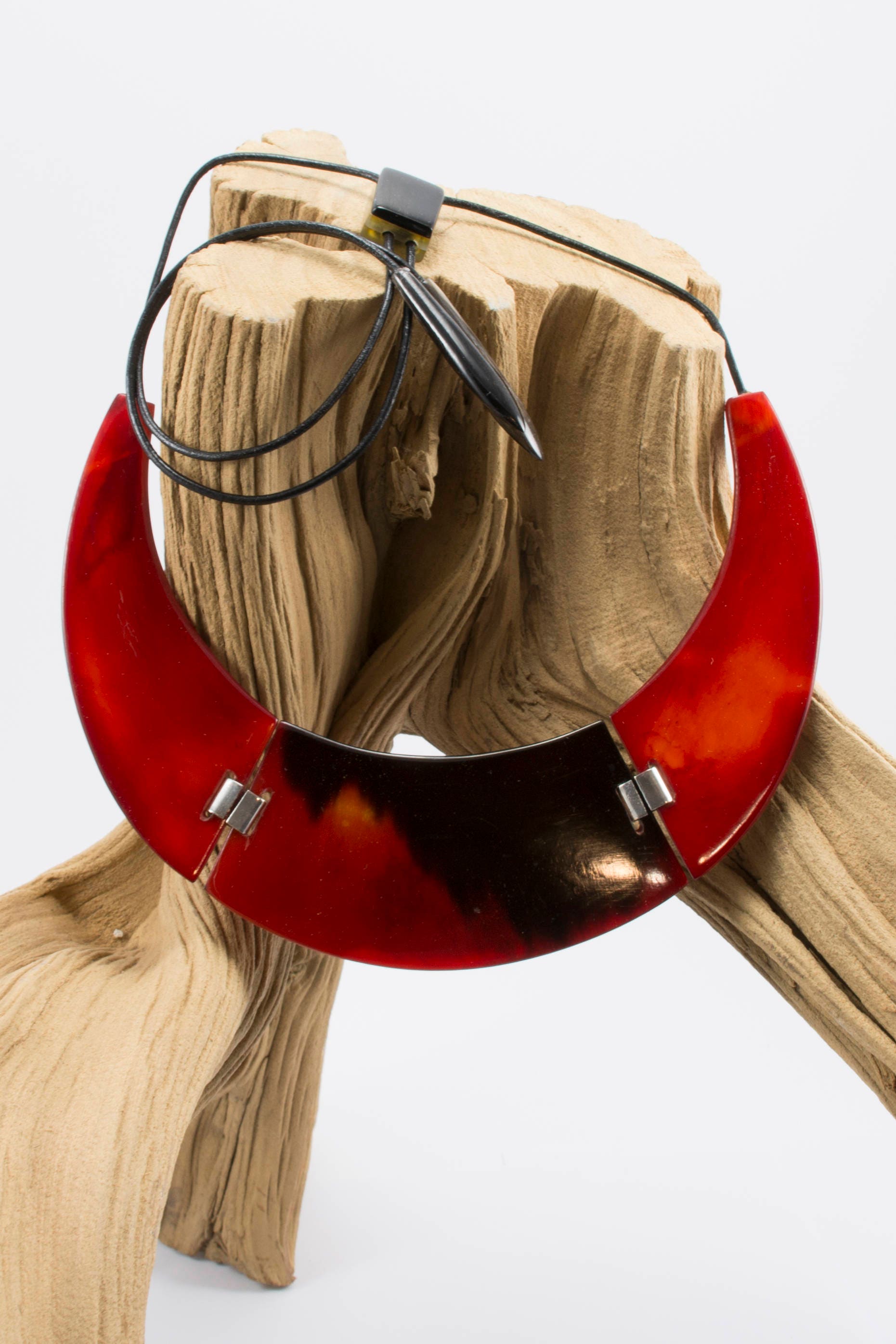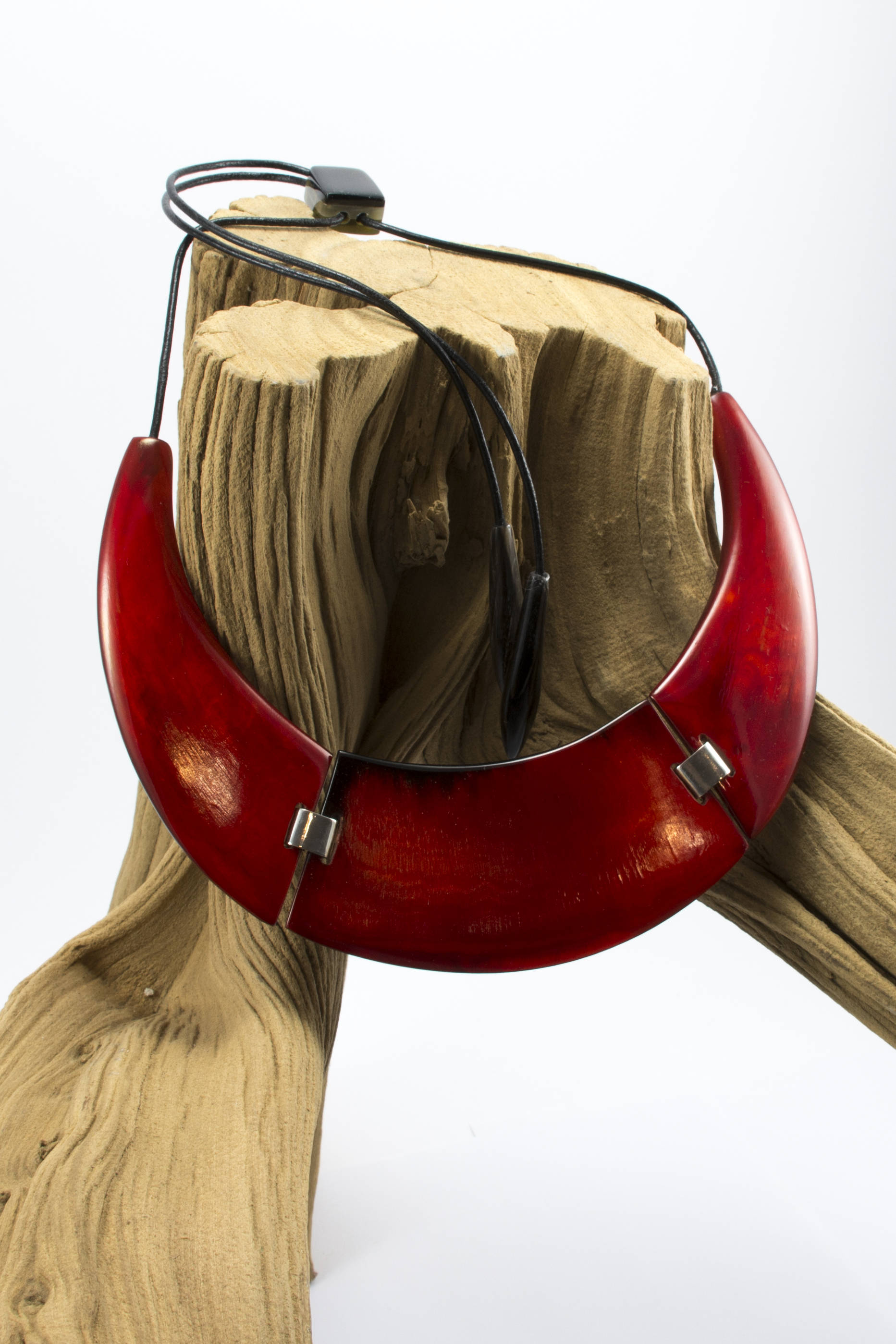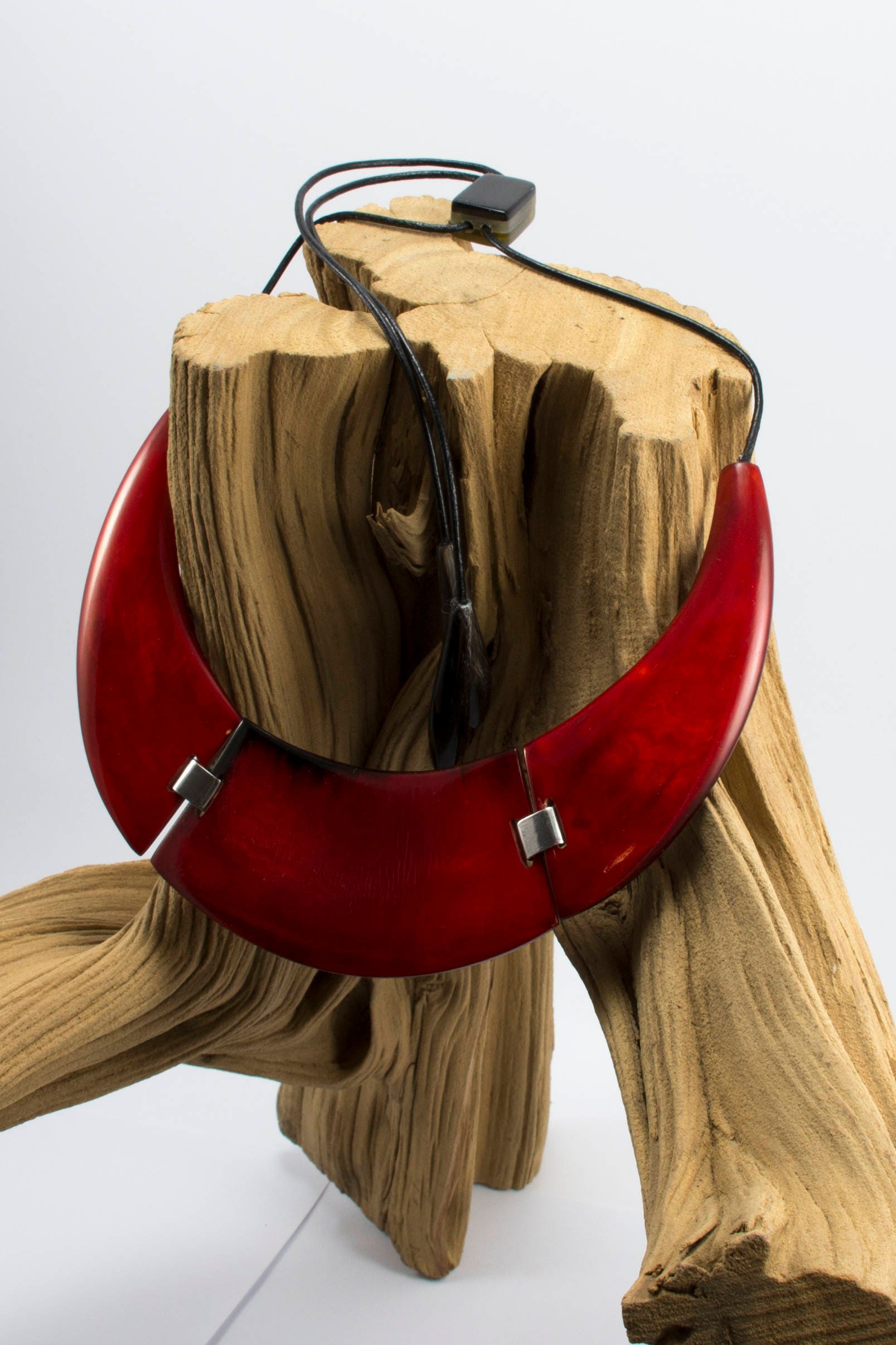 The Red Gothic Necklace is a stunning piece of jewelry that combines elegance and uniqueness, making it a must-have accessory for any fashion enthusiast. Crafted from high-quality horn, this necklace features a distinctive crescent shape that is both eye-catching and sophisticated. The rich red tones of the necklace are achieved through meticulous handwork, allowing for a variety of shades that make each piece truly one-of-a-kind.