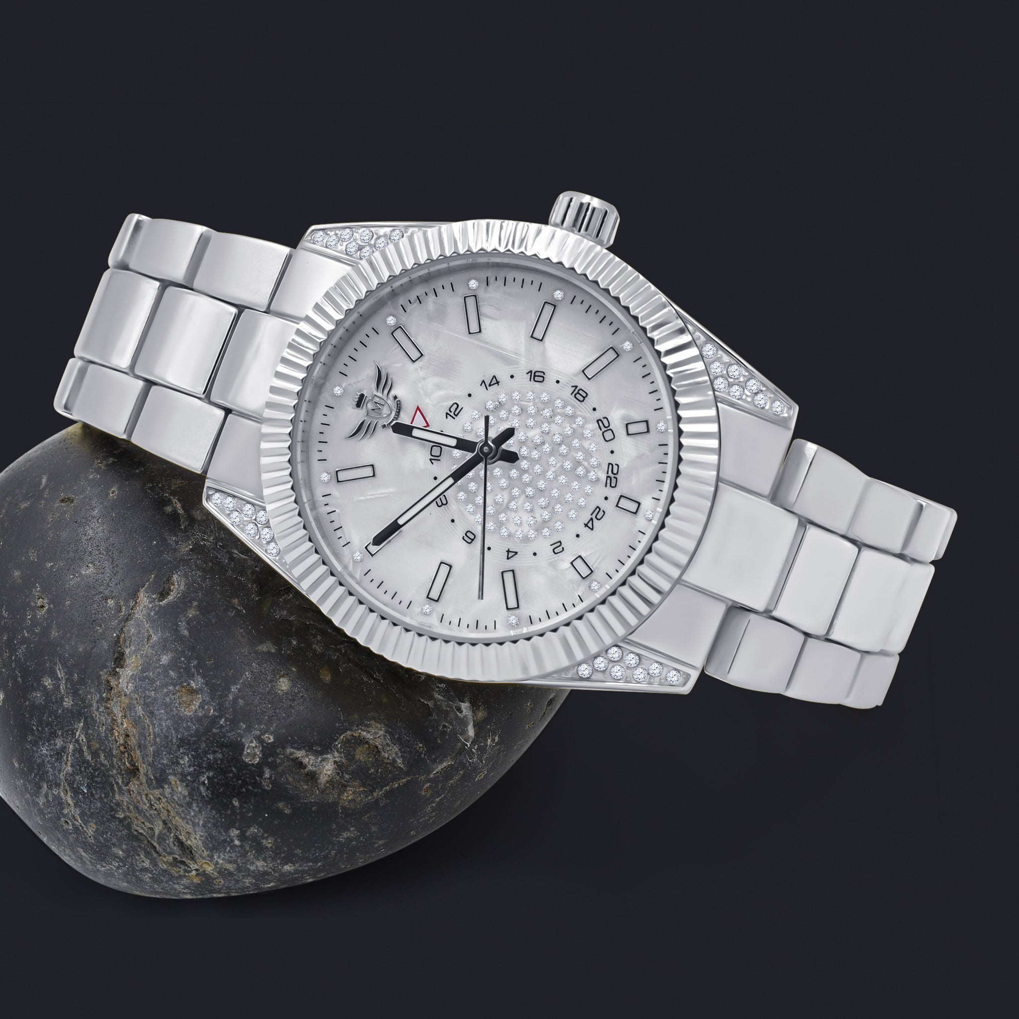 This watch features a fully bling metal band that shines brilliantly in any light, ensuring you stand out in a crowd. The solid alloy construction guarantees durability, while the steel back cover adds an extra layer of robustness. Weighing in at 137 grams, it strikes the perfect balance between being lightweight and substantial on your wrist.