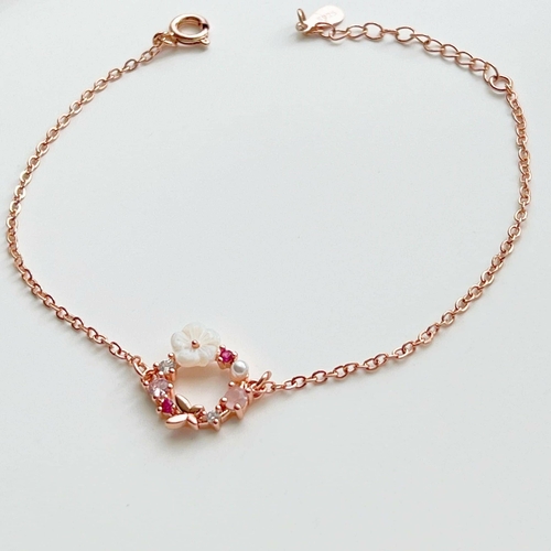 This exquisite bracelet is made from gold-plated bronze, ensuring durability while maintaining a luxurious appearance. The flower wreath is adorned with sparkling pink crystals and a lustrous pearl, adding a touch of sophistication to any outfit. The size of the wreath is approximately 11mm x 11mm, making it a delicate yet eye-catching accessory.