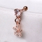 The earring features a delicate flower design that dangles gracefully from the barbell. The flower is adorned with small clear cubic zirconia (CZ) stones on the petals, adding a sparkle that catches the light beautifully. The overall aesthetic is both chic and sophisticated, making it suitable for various occasions, from casual outings to formal events.