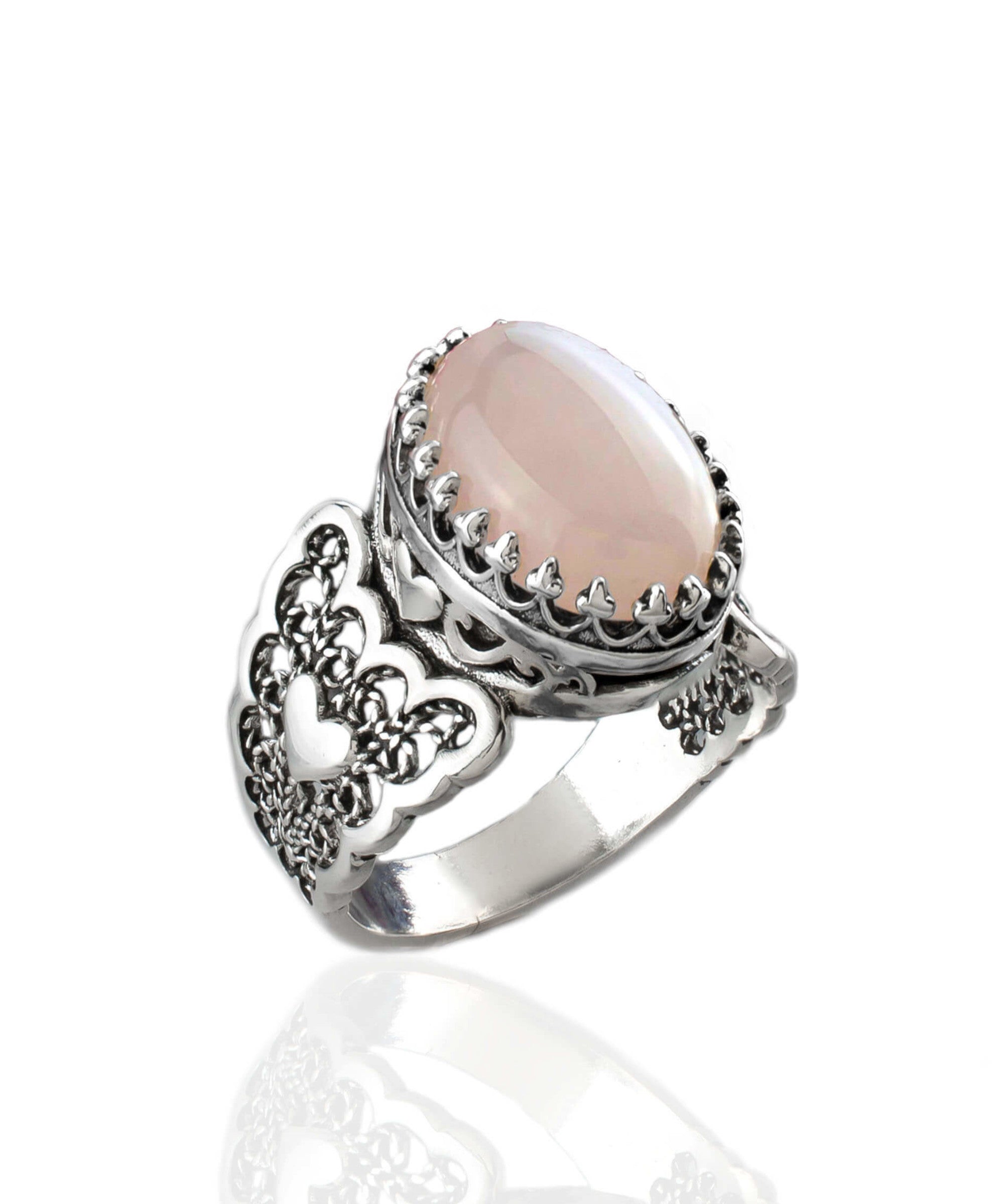 Rose Quartz Gemstone Double Heart Ring in 925 Sterling Silver with intricate filigree design, showcasing a pink cabochon oval cut gemstone.