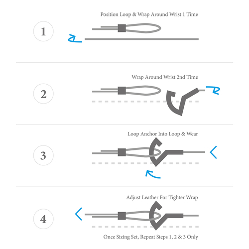 SIZING This bracelet is one size fits all, with the leather able to suit your wrist size. To take the bracelet on or off your wrist, simply slide the leather through the logo cube to make the loop size smaller or larger. Once set, keep the loop size consistent and continue wearing by double wrapping the bracelet and (un)clutching the leather loop from the anchor clasp. Less is More.