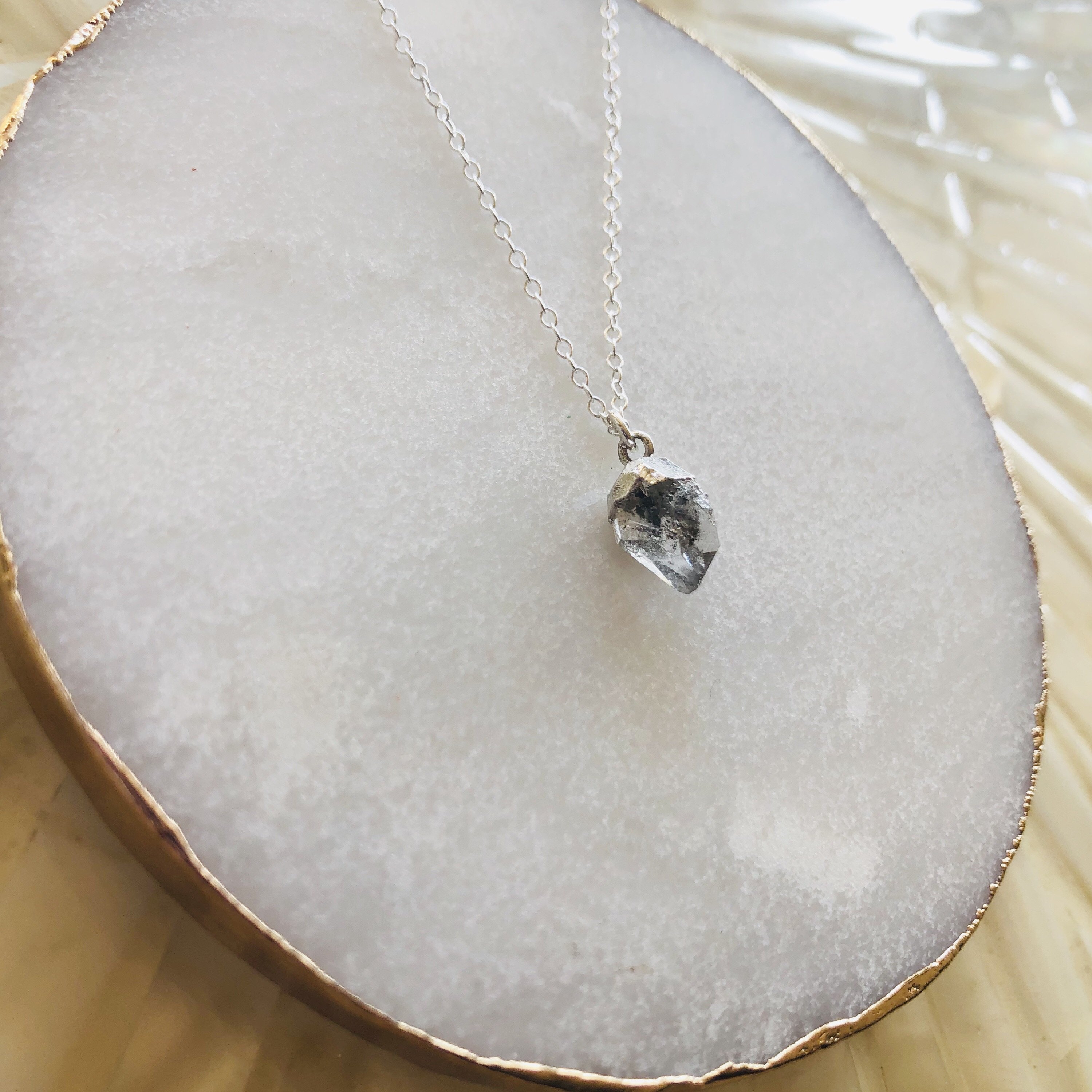 Introducing the stunning Salt and Pepper Herkimer Diamond Necklace in silver, a perfect accessory for those who appreciate unique and elegant jewelry. This exquisite necklace is designed to catch the eye of every beholder, making it an ideal choice for everyday wear. Each necklace is crafted with genuine Herkimer diamonds, known for their distinctive salt and pepper appearance, ensuring that no two pieces are alike. This uniqueness adds a personal touch to your jewelry collection, allowing you to express your individuality.