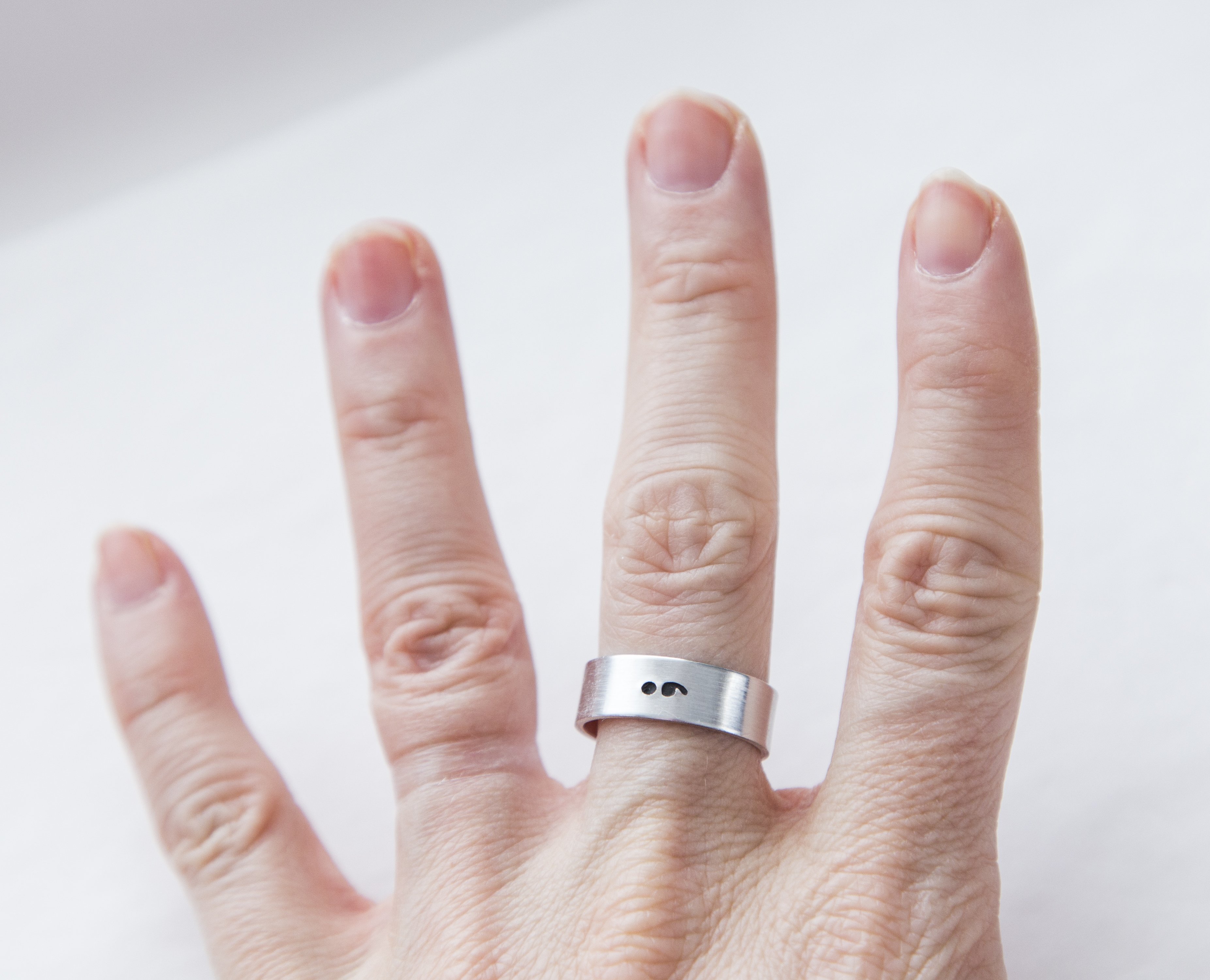 Each Semicolon Ring is hand-stamped one letter at a time, which means that no two rings are exactly alike. This handmade quality adds to the charm and uniqueness of the piece, as the letters may not be perfectly straight or centered. This slight imperfection is what gives the ring its character and makes it a truly special item.