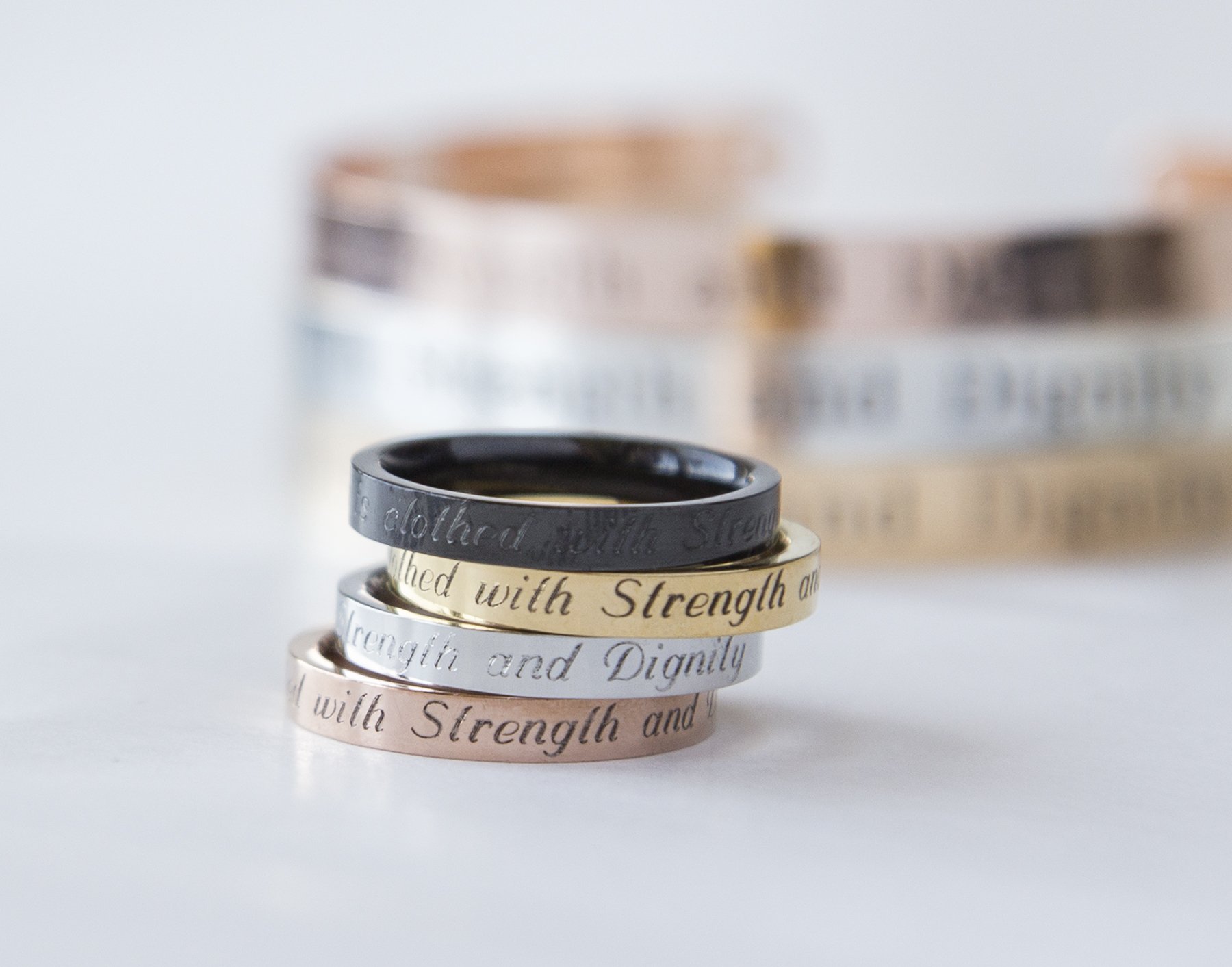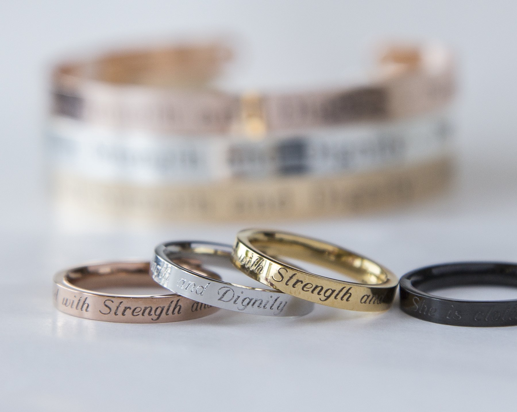 Each ring is meticulously engraved on the outside, showcasing the powerful message of Proverbs 31:25. The engraving is designed to last, ensuring that the words remain clear and beautiful over time. The stainless steel construction not only provides a sturdy base but also resists tarnishing, making it an ideal choice for everyday wear.