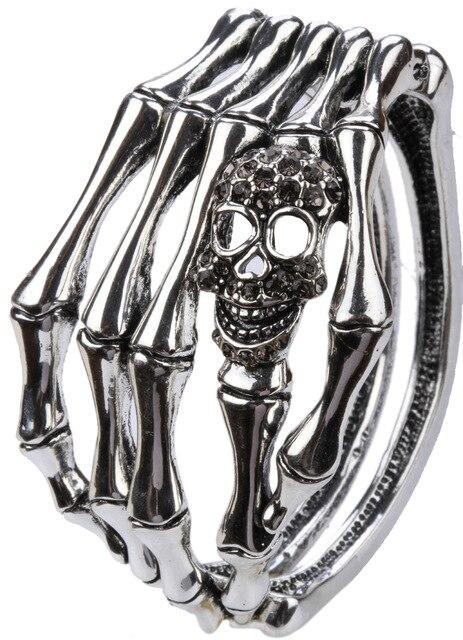 With its antique silver plating, the Skull Skeleton Hand Bracelet offers a vintage appeal that complements various outfits. Whether you're dressing up for a night out or adding flair to your everyday look, this bangle is versatile enough to suit any occasion. Its unique design makes it a conversation starter, allowing you to express your individuality and style.