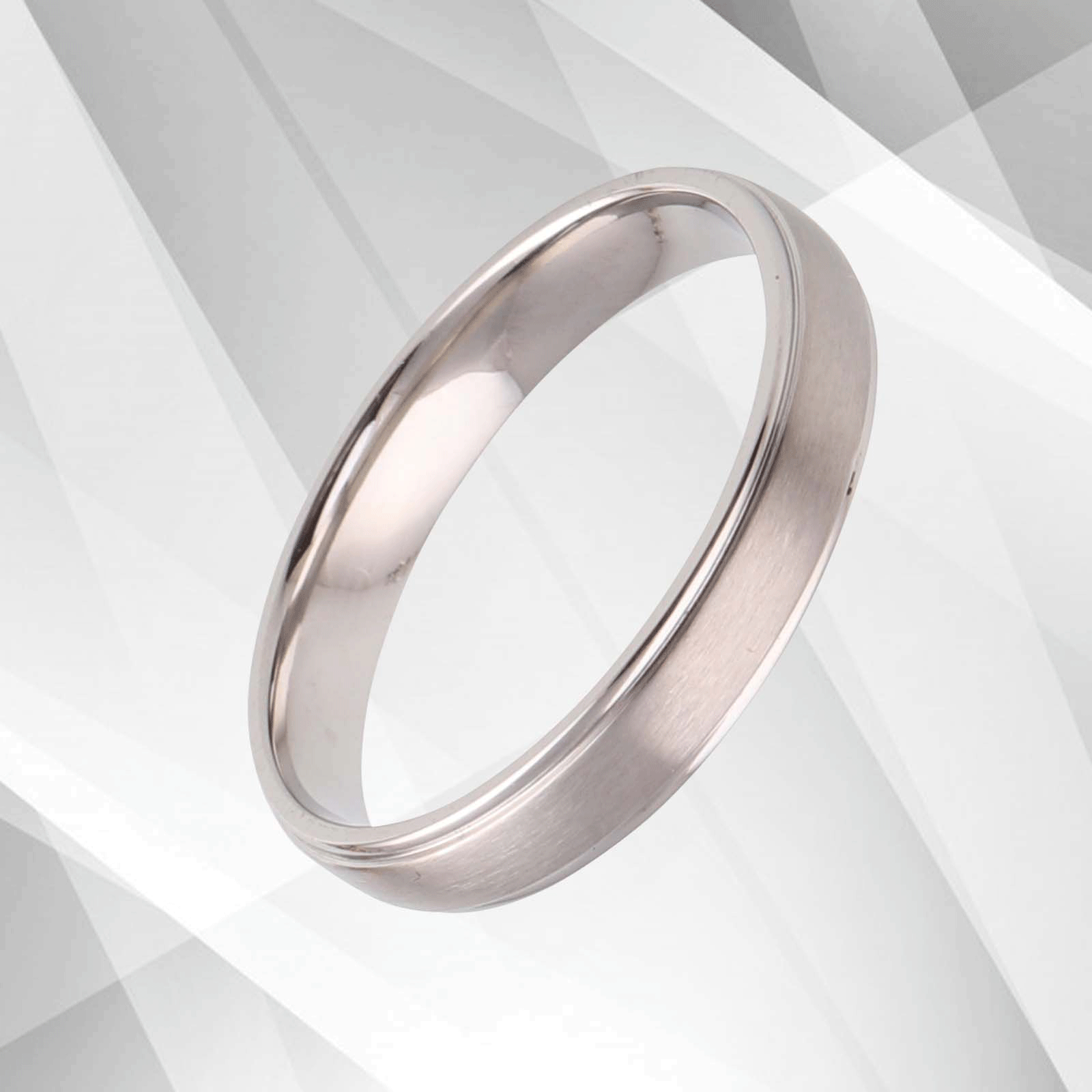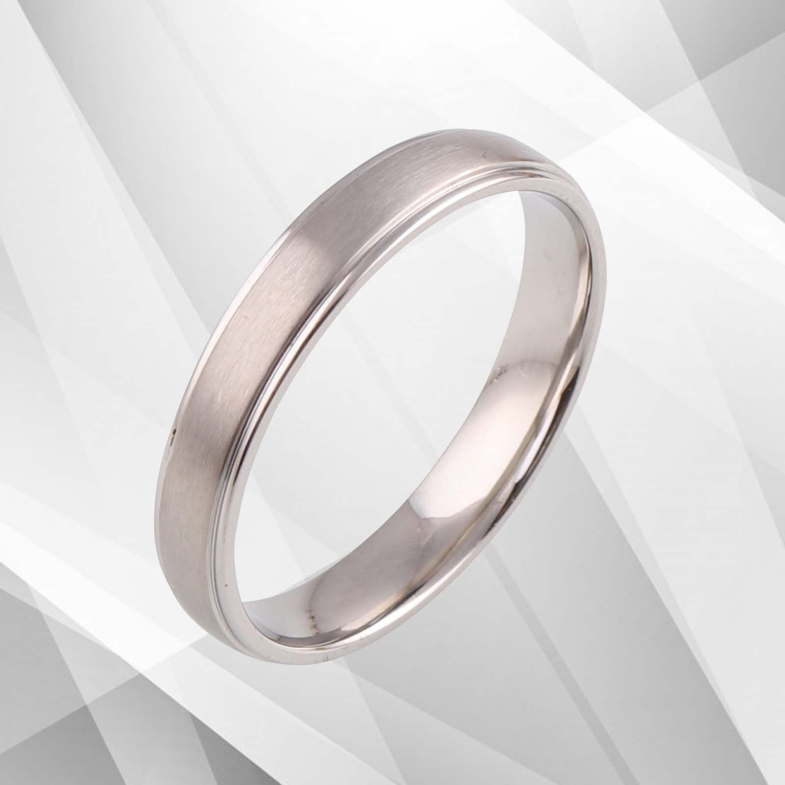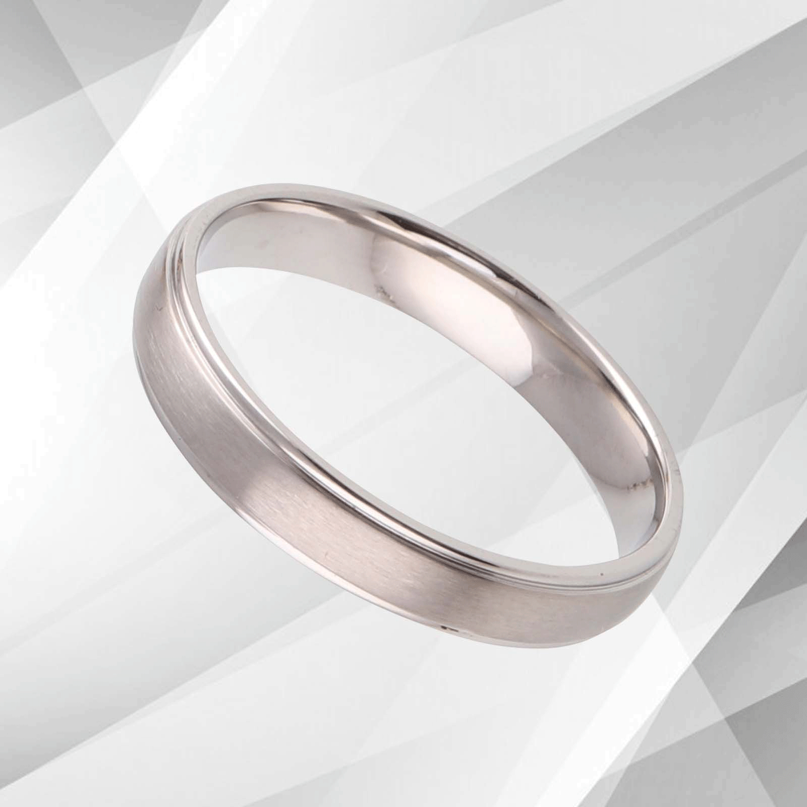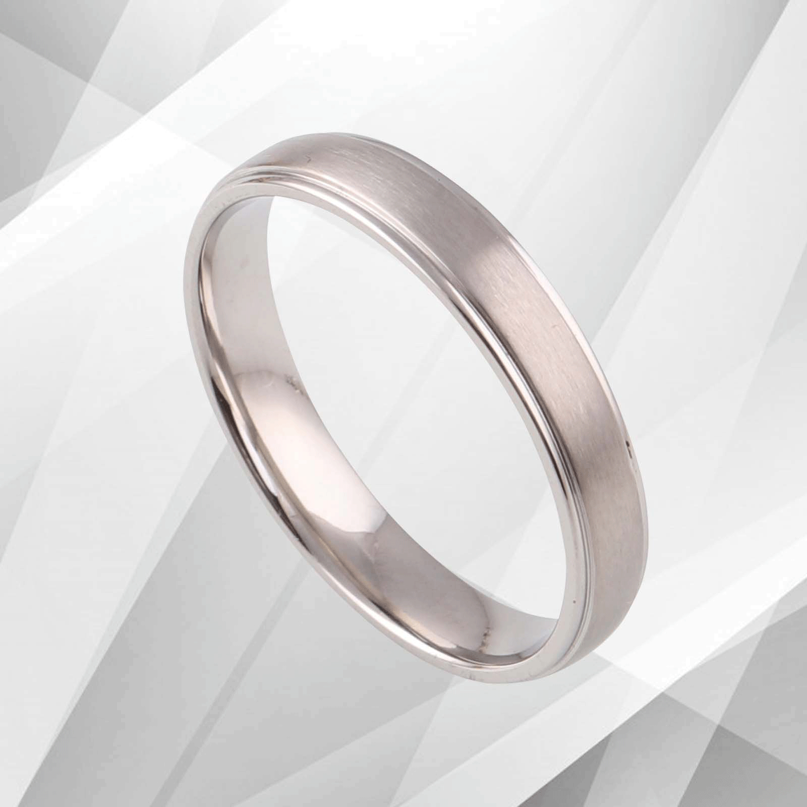 Sleek 4mm Men's Wedding Anniversary Engagement Band Ring made of brushed titanium with 18Ct white gold finish, showcasing its elegant design.