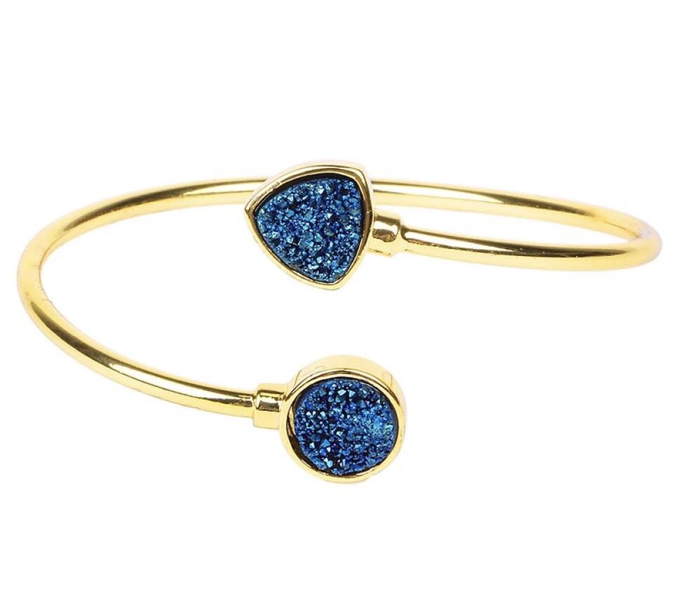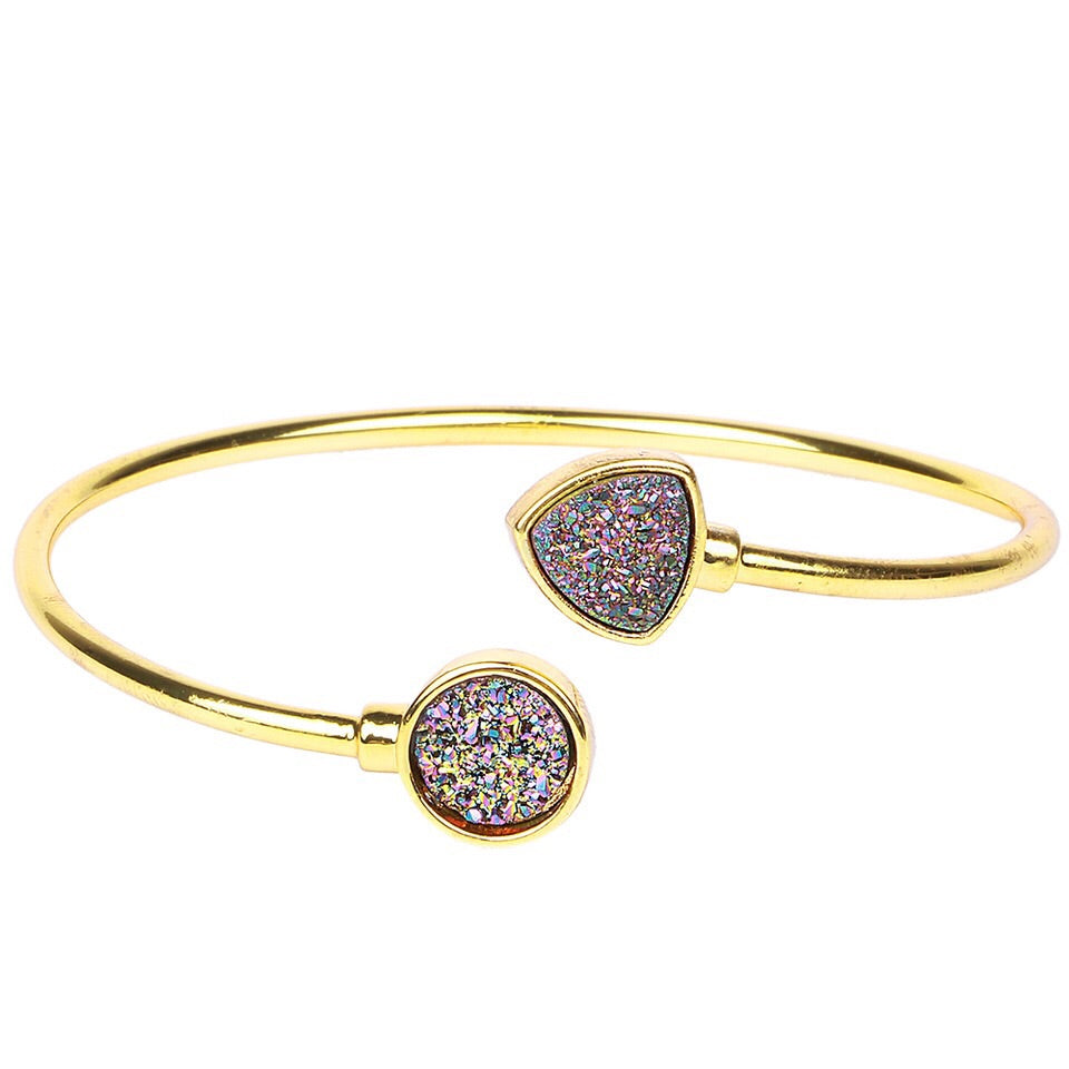 Introducing the Sparkling Druzy Adjustable Bangle, a stunning piece of jewelry that combines elegance and versatility. This bangle features a dazzling druzy stone set on a 24K gold plated adjustable band, making it a perfect accessory for any occasion. Whether you're dressing up for a night out or adding a touch of glamour to your everyday look, this bangle is sure to turn heads.