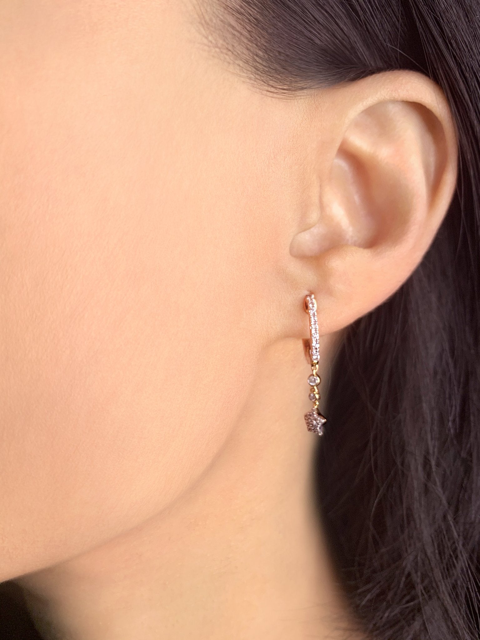 Measuring 5.9mm in width and 25mm in length from the earlobe, these hoop earrings are designed to make a statement without being overly bold. The unique star bezel design adds a touch of whimsy and charm, making them suitable for both casual and formal occasions. Whether you're dressing up for a night out or adding a touch of elegance to your everyday look, these earrings are the perfect accessory.