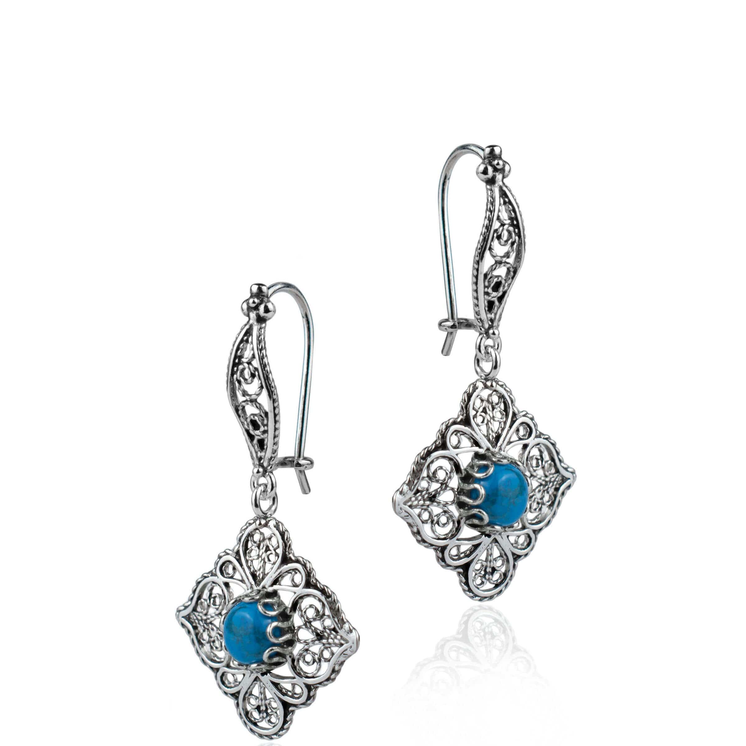 Sterling Silver Filigree Art Turquoise Gemstone Dangle Drop Earrings showcasing intricate design and vibrant turquoise stone.