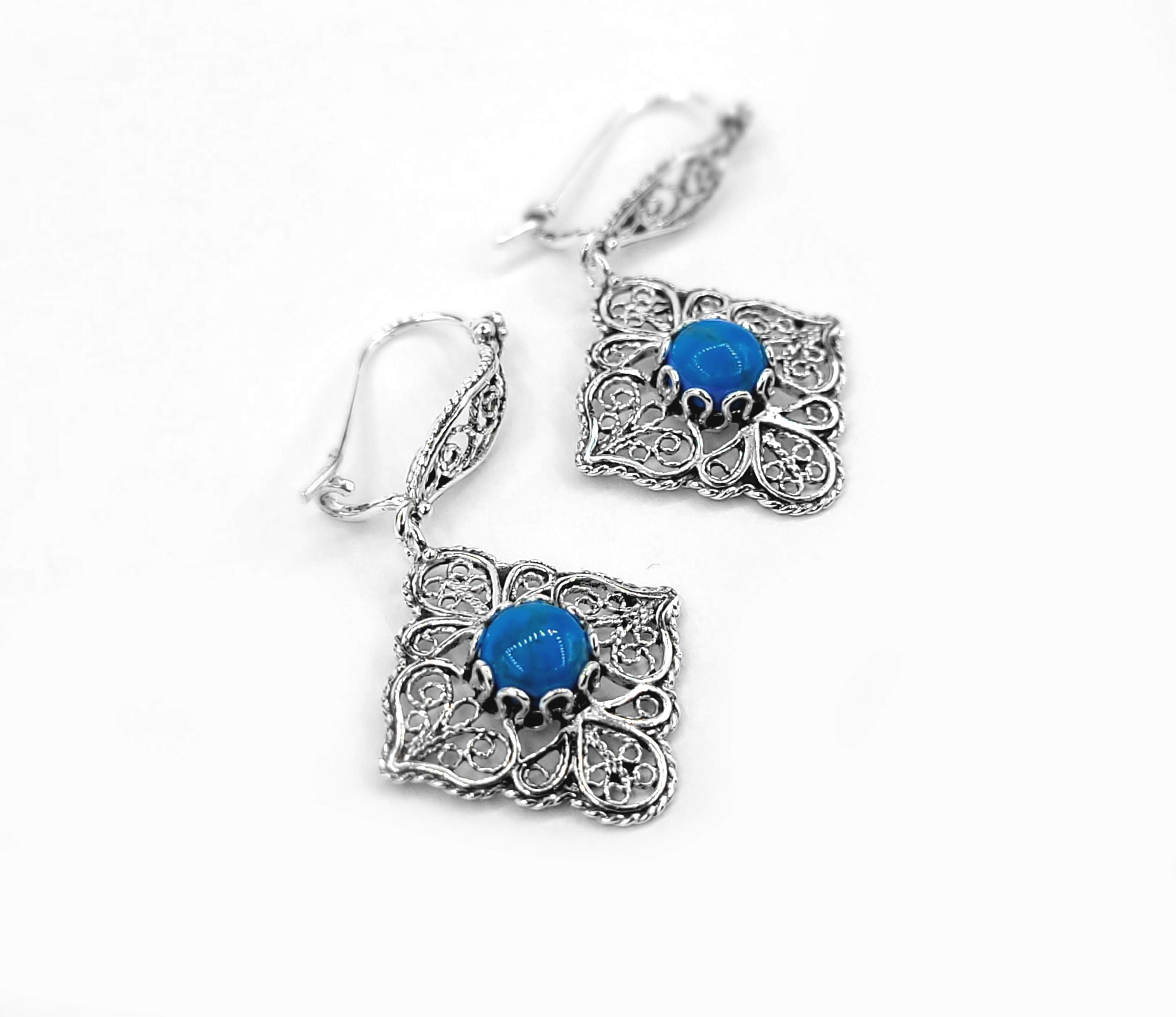 Introducing our exquisite Sterling Silver Filigree Art Turquoise Gemstone Women Dangle Drop Earrings, a stunning accessory that combines elegance and artistry. These earrings are designed to make a statement while providing a touch of sophistication to any outfit. Crafted from high-quality sterling silver, they feature a beautiful turquoise gemstone that adds a pop of color and charm.