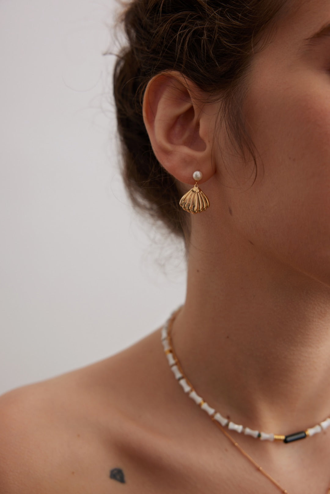 Crafted from high-quality 925 silver, these earrings are designed to last while maintaining their stunning appearance. The shell pearls used in the design are lustrous and eye-catching, providing a beautiful contrast against the vintage gold color of the earrings. The combination of pure silver and shell pearls creates a harmonious blend of elegance and simplicity, making these earrings versatile enough to complement any wardrobe.