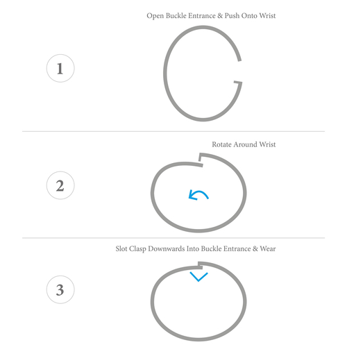 This bangle is available in one size only, 55mm between inside surfaces across the wrist which roughly equates to 19cm around the wrist. To take the bangle on or off your wrist, simply (un)slot the clasp from the gate. The shape of the bangle can be lightly adjusted to suit.