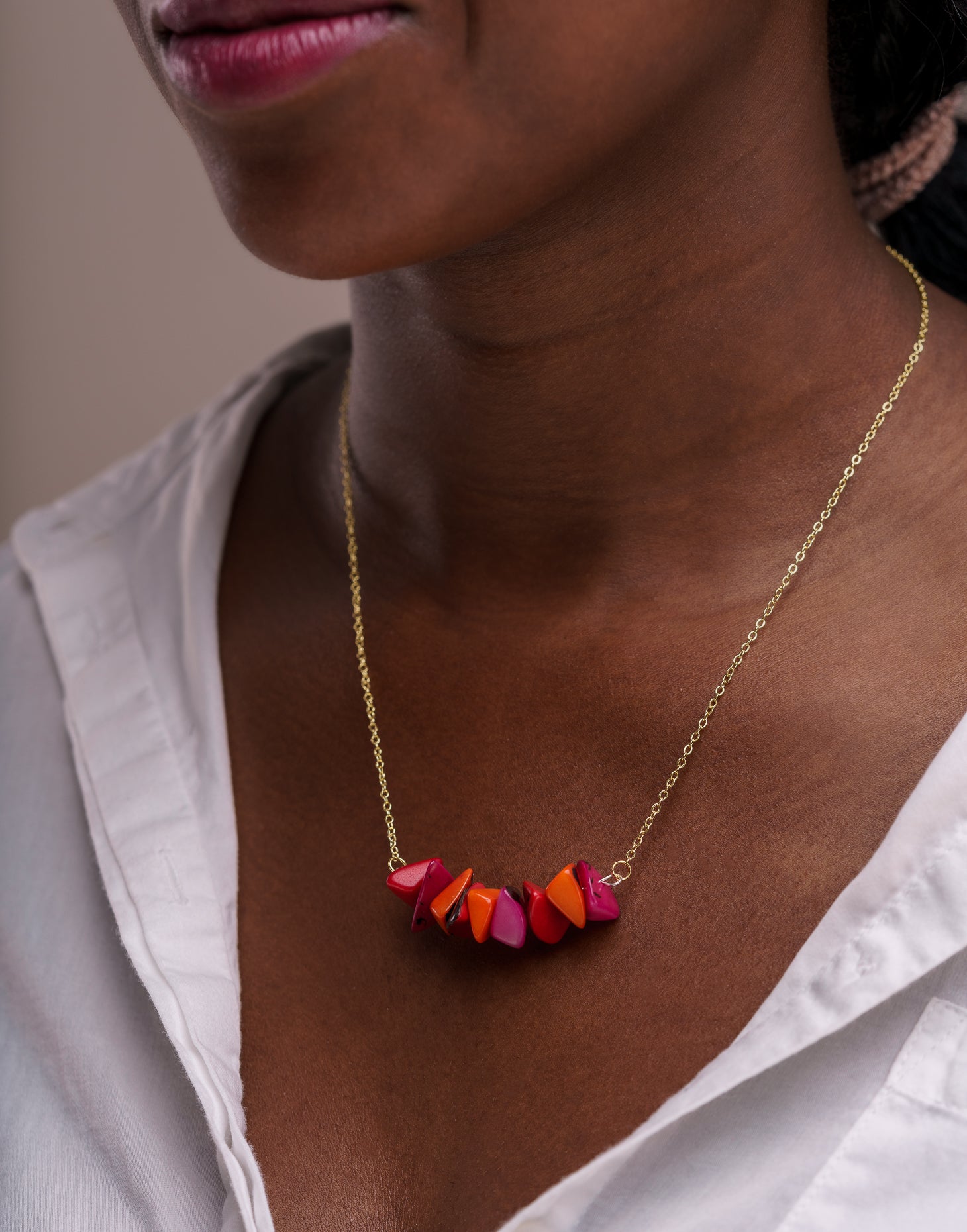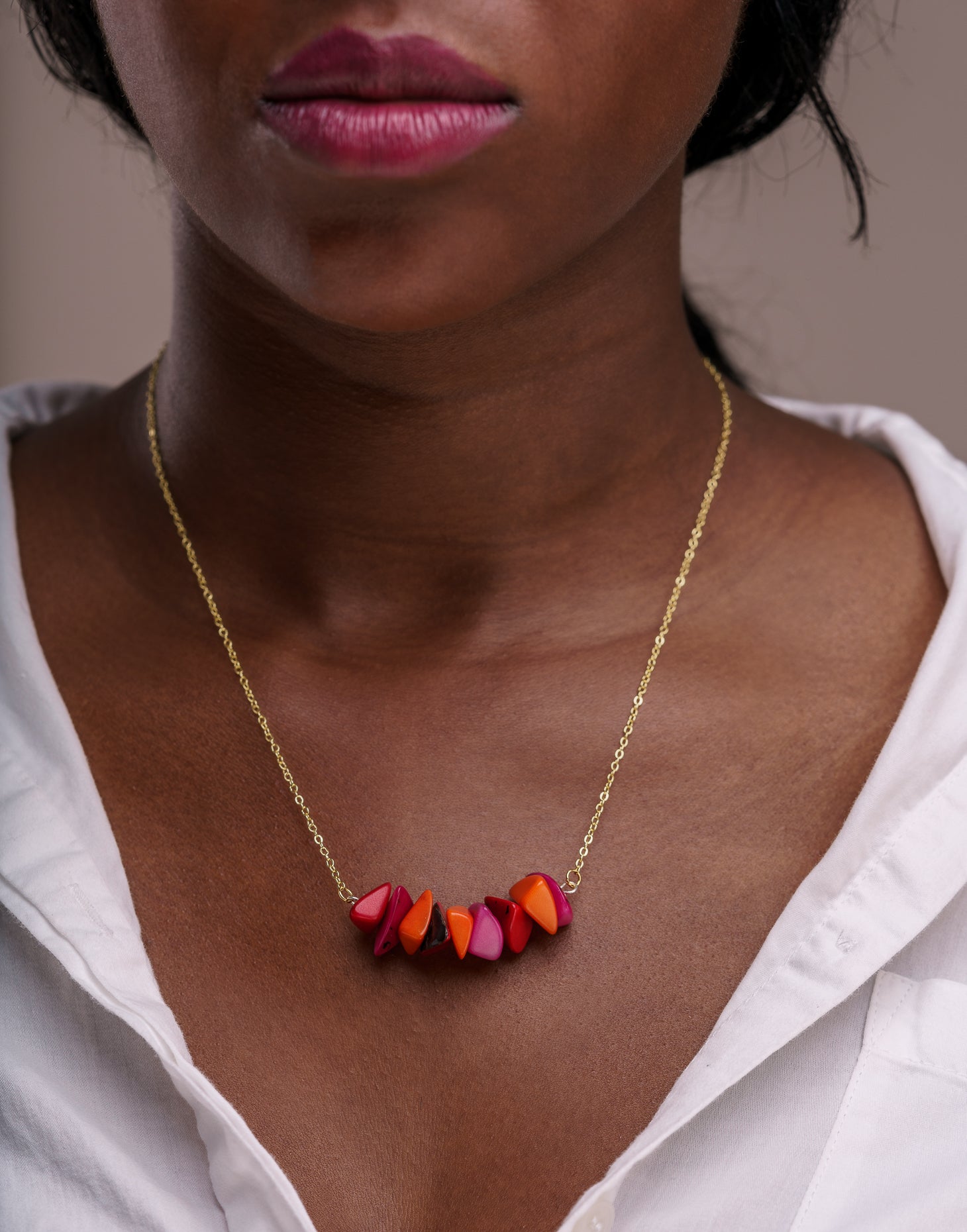 The Tapajos Tagua Chain Necklace is a stunning piece of handmade jewelry that combines elegance with sustainability. Crafted from beautiful Tagua nut shavings, this necklace resembles exquisite stone cuts, making it a perfect accessory for any occasion. Whether you're dressing up for a special event or looking for a chic addition to your everyday outfit, this necklace is versatile enough to suit any style.