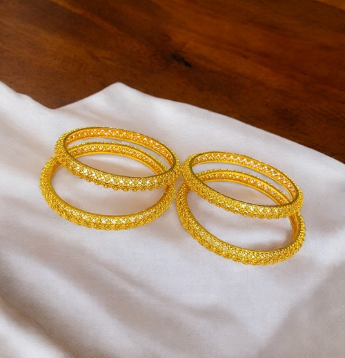 Gold-plated bangles are often adorned with intricate designs, including traditional motifs such as paisleys, flowers, and geometric patterns. They are frequently embellished with gemstones, enamel work, or delicate filigree, making them versatile for both daily wear and special occasions. Their lightweight nature and affordable price make them popular among a broad range of people, from those seeking elegant accessories for everyday wear to those looking to complement their festive attire.