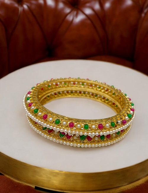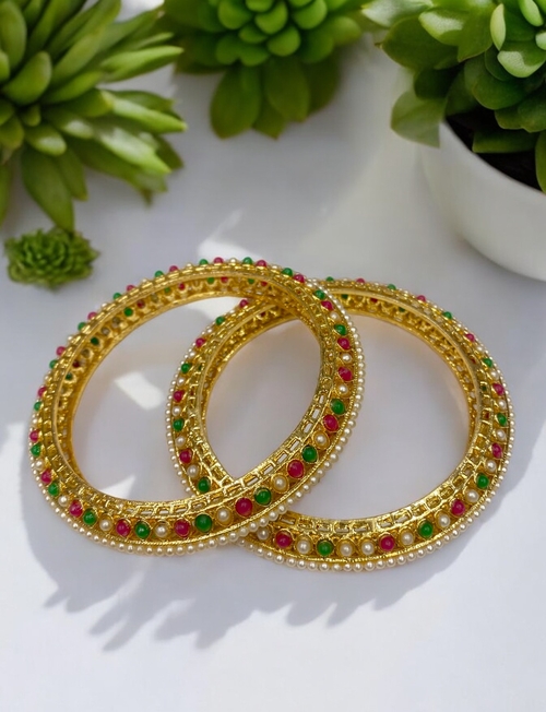 Gold-plated bangles are often adorned with intricate designs, including traditional motifs such as paisleys, flowers, and geometric patterns. They are frequently embellished with gemstones, enamel work, or delicate filigree, making them versatile for both daily wear and special occasions. Their lightweight nature and affordable price make them popular among a broad range of people, from those seeking elegant accessories for everyday wear to those looking to complement their festive attire.