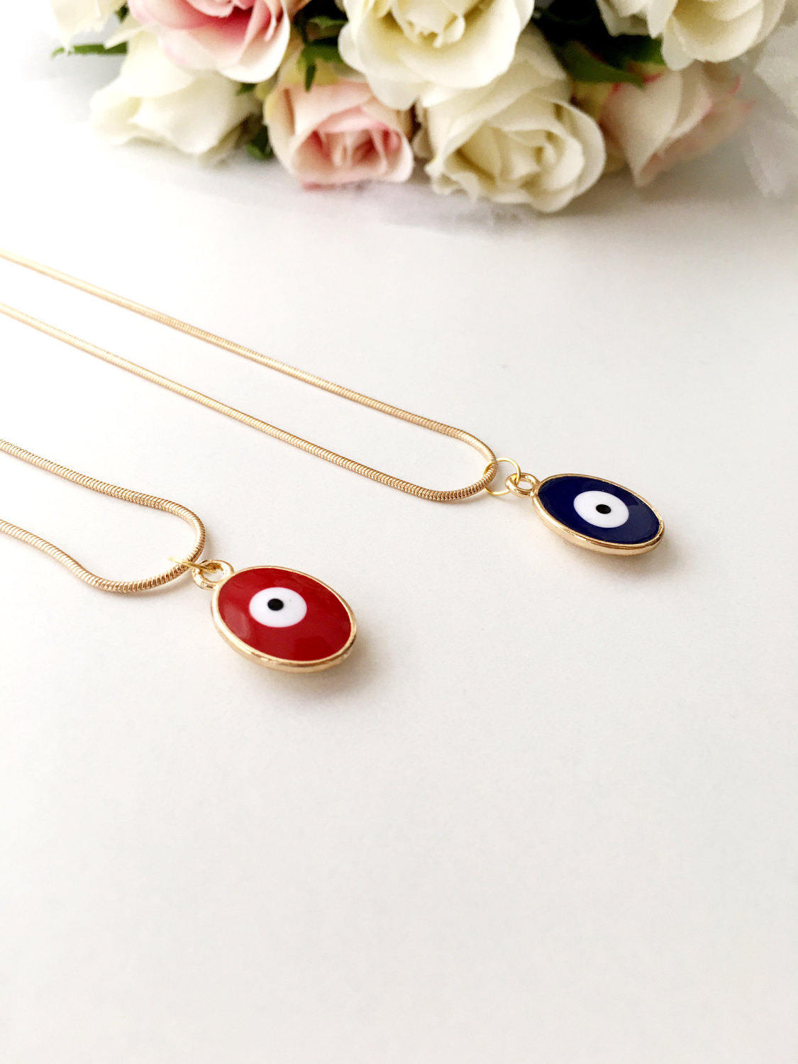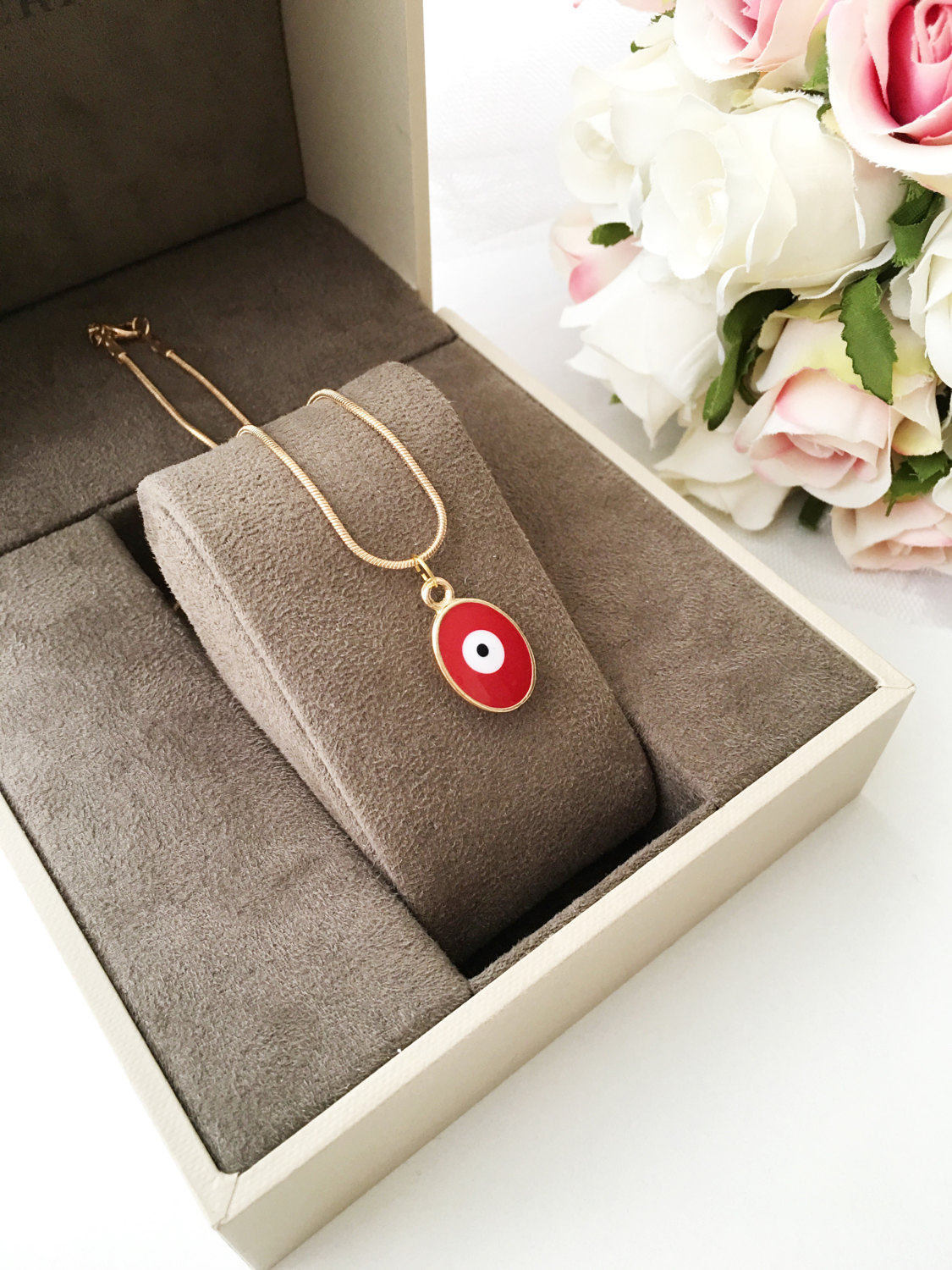 The Tiny Evil Eye Necklace is a beautifully crafted piece of evil eye jewelry that combines elegance with cultural significance. This stunning necklace features a unique design that showcases both blue and red oval brass beads, symbolizing protection and good fortune. The necklace is entirely handmade, ensuring that each piece is unique and of the highest quality.