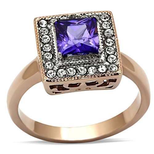 TK1162 Two-Tone IP Rose Gold Stainless Steel Ring featuring AAA Grade CZ center stone in tanzanite color, showcasing its elegant design.