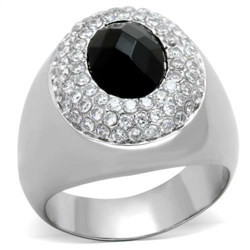 The centerpiece of the TK1812 ring is a synthetic glass stone, which is both striking and durable. The synthetic glass is designed to mimic the appearance of natural gemstones while offering a more affordable option. The center stone is jet black in color, providing a bold contrast against the shiny stainless steel band. This combination creates a timeless look that can be worn for any occasion, from casual outings to formal events.