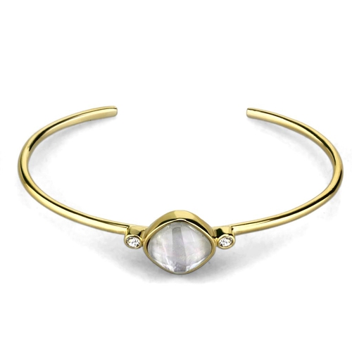 The TK2910 - IP Gold Stainless Steel Bangle is a stunning piece of jewelry that combines elegance and durability. Crafted from high-quality stainless steel, this bangle features a luxurious IP gold ion plating that gives it a radiant finish. The centerpiece of this exquisite bangle is a precious Conch stone, known for its unique beauty and white color, making it a perfect accessory for any outfit.