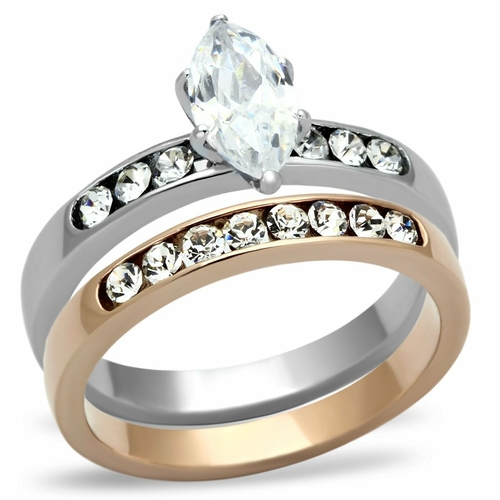 The TK965 Two-Tone IP Rose Gold Stainless Steel Ring is a stunning piece of jewelry that combines elegance and durability. This exquisite ring is designed for those who appreciate fine craftsmanship and want to make a statement. With its beautiful two-tone finish and AAA grade cubic zirconia (CZ) stone, this ring is perfect for any occasion, whether it's a special event or everyday wear.