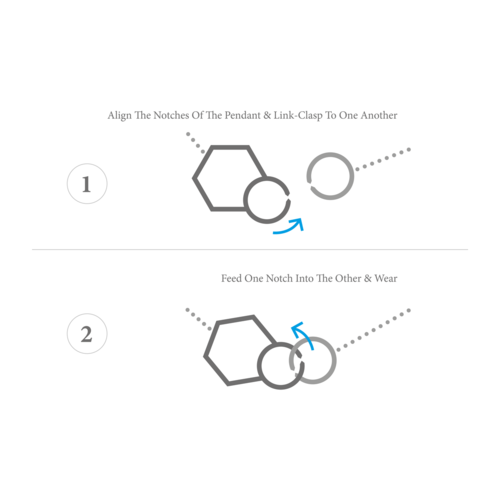 This pendant necklace is available in three chain lengths, 16 inch (40cm), 18 inch (45cm) or 20 inch (50cm) long, and is complete with a circular notched link-clasp that sits alongside the pendant in front of the neck. To take the necklace on or off your neck, simply align the small notch of the circular link-clasp to the small notch of the pendant and feed one into the other.