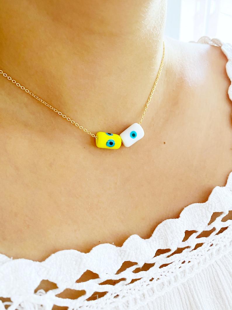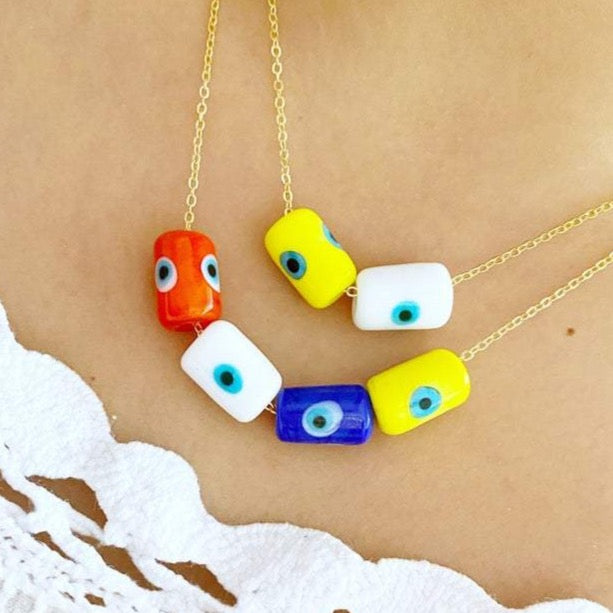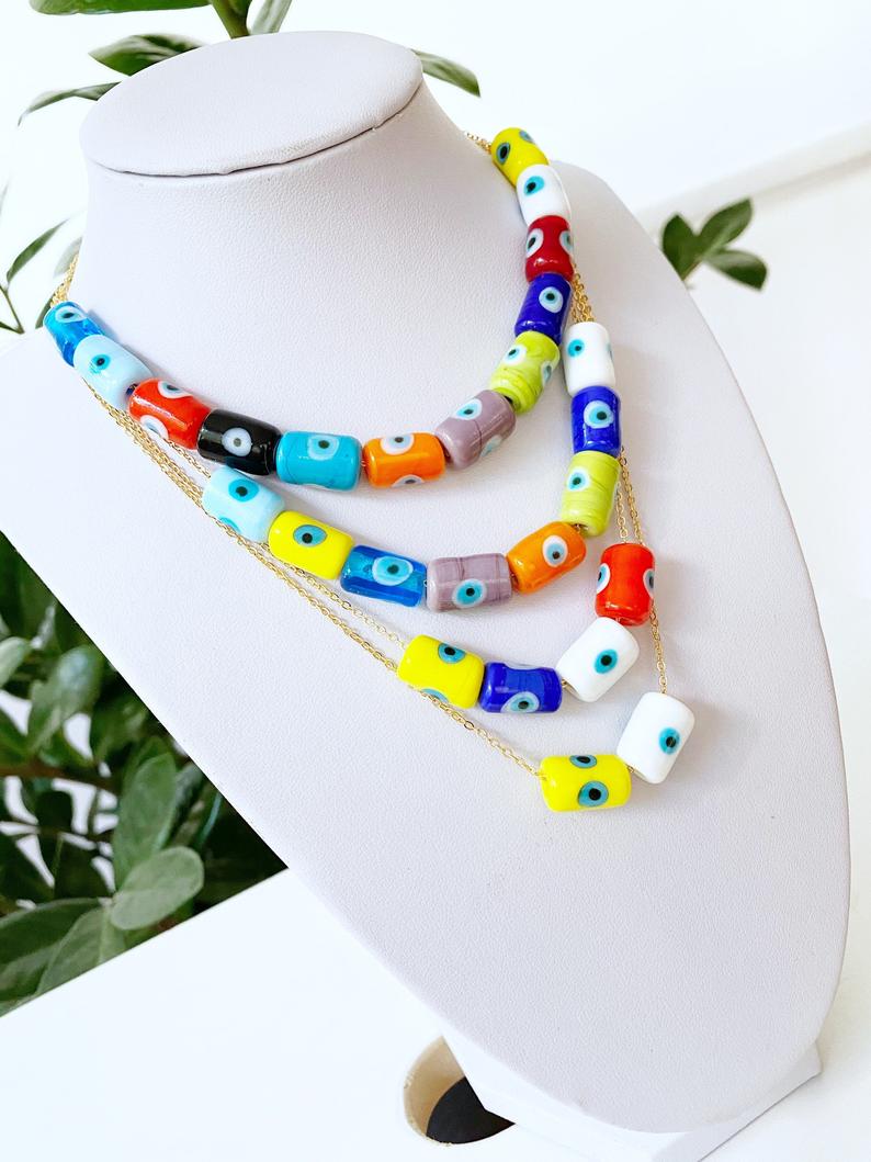 Introducing our exquisite Tube Beads Necklace, a stunning piece of summer jewelry that combines elegance with the protective symbolism of the Evil Eye. Crafted with high-quality glass Murano beads, this necklace is not just an accessory; it's a statement of style and cultural significance. The Evil Eye is believed to ward off negative energy and bring good luck, making this necklace a meaningful addition to your jewelry collection.