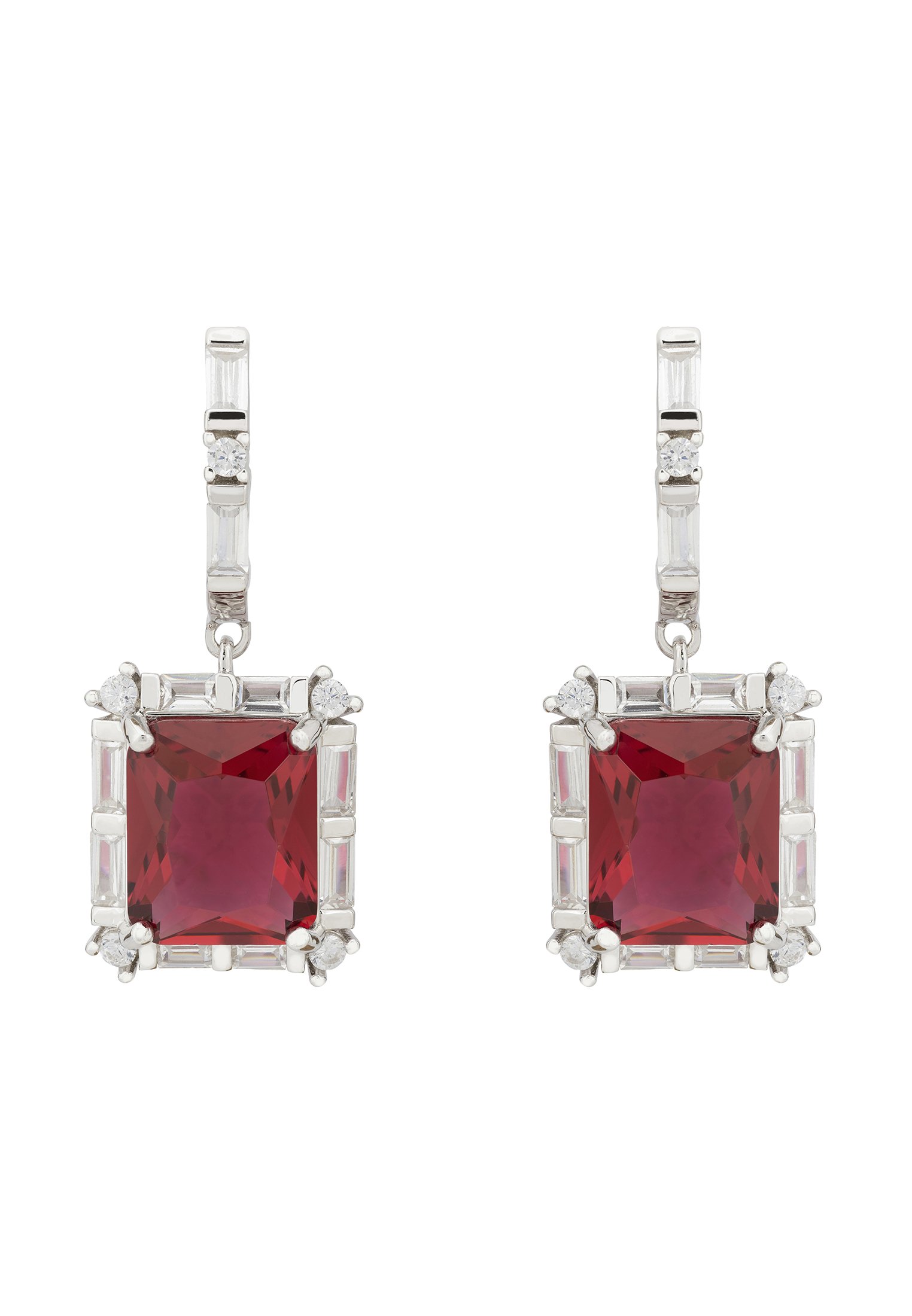 Introducing the exquisite Tudor Silver Earring Ruby, a stunning piece of jewelry that embodies elegance and sophistication. These drop earrings are designed to be a staple in your everyday wardrobe, effortlessly transitioning from day to night. The multifaceted rectangle-shaped cultured ruby gemstone takes center stage, surrounded by dazzling baguette cut cubic zirconia detailing that enhances its beauty and brilliance.