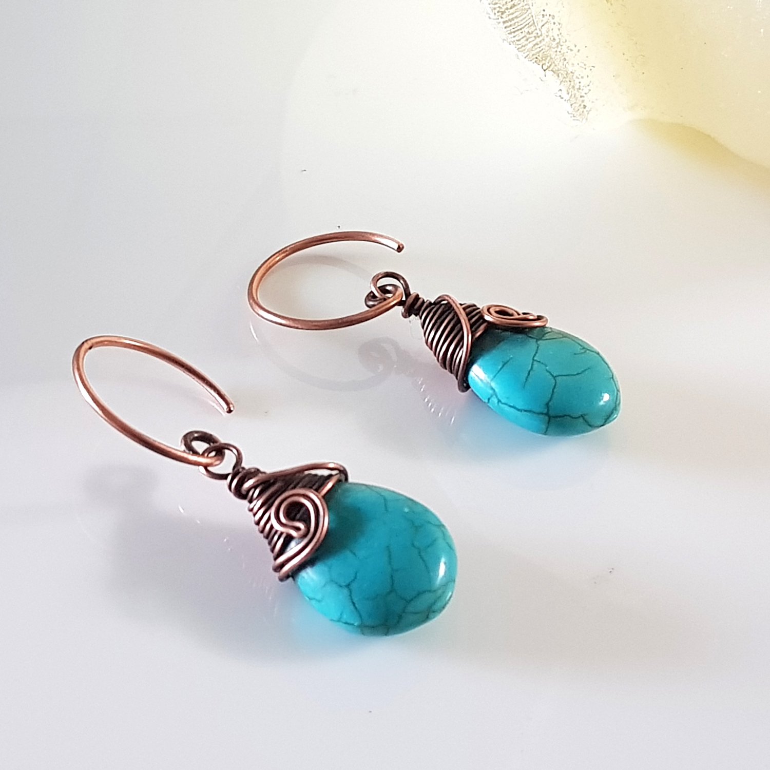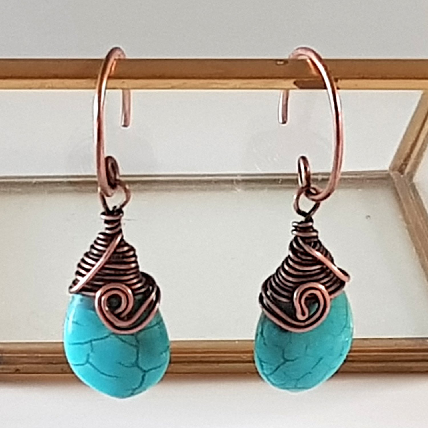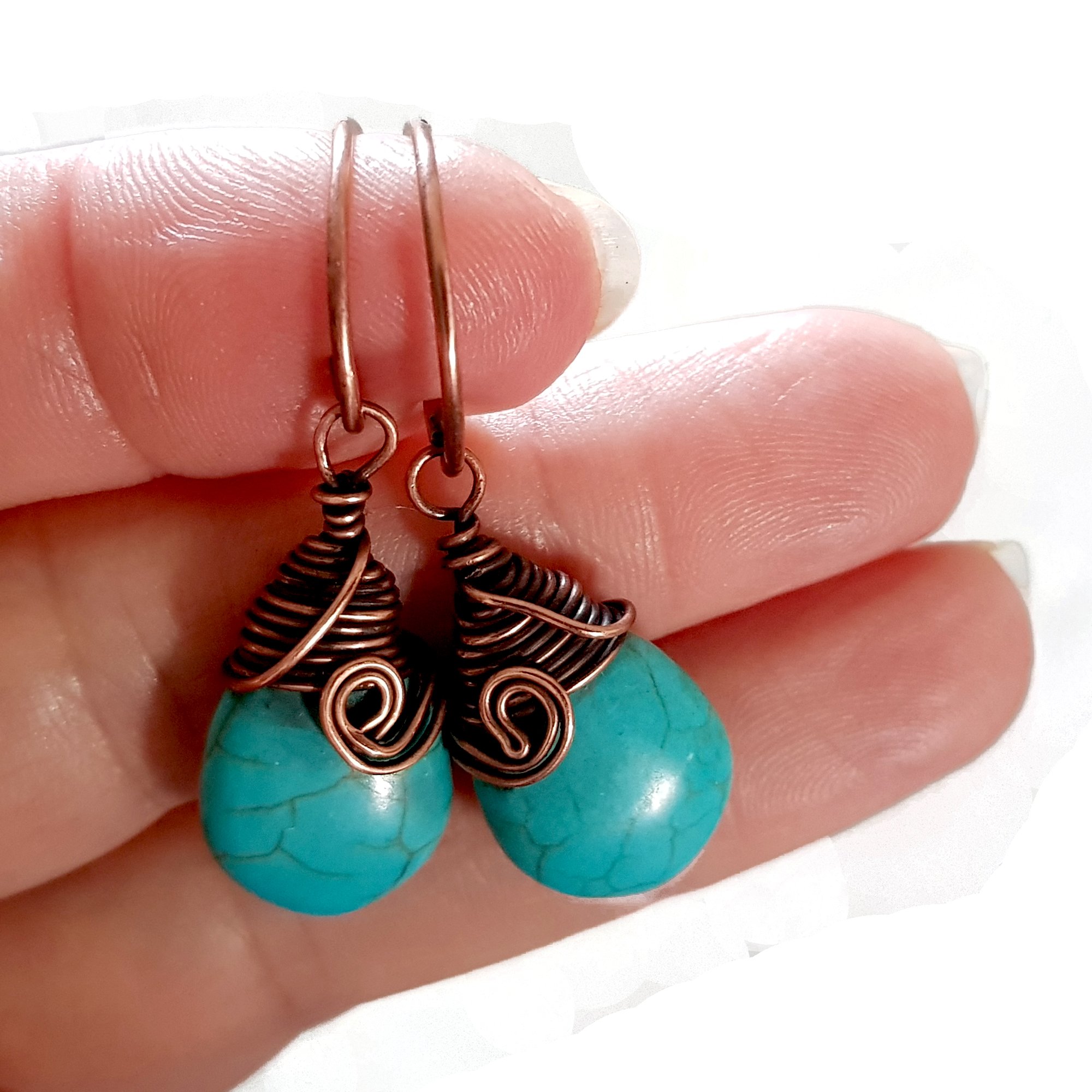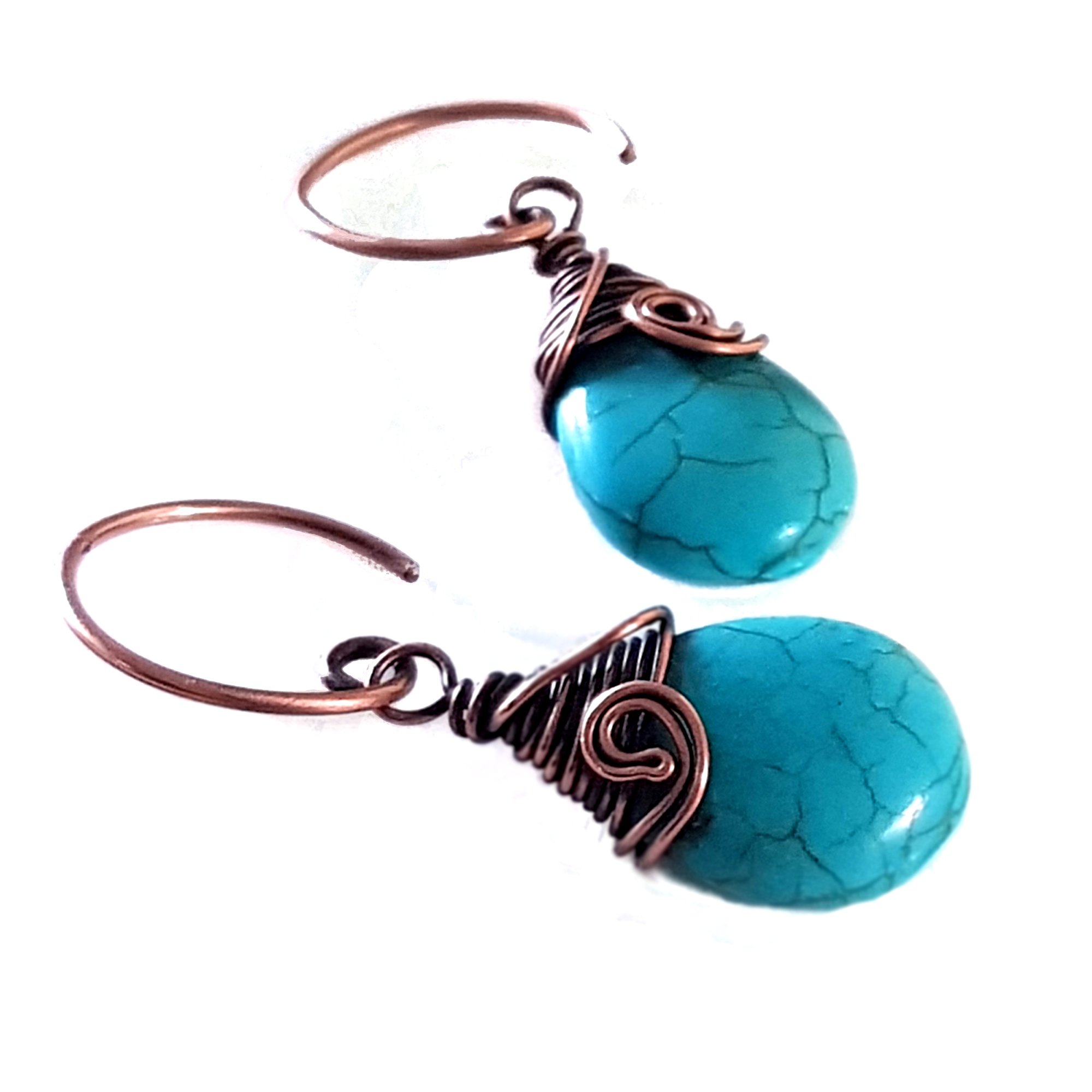 Each pair of earrings features a teardrop-shaped howlite stone, known for its calming properties and beautiful turquoise hue. The howlite is expertly wrapped with copper wire at the top, adding a touch of sophistication and warmth. The design is completed with a copper swivel at the front, ensuring that the earrings hang beautifully and move gracefully with you.