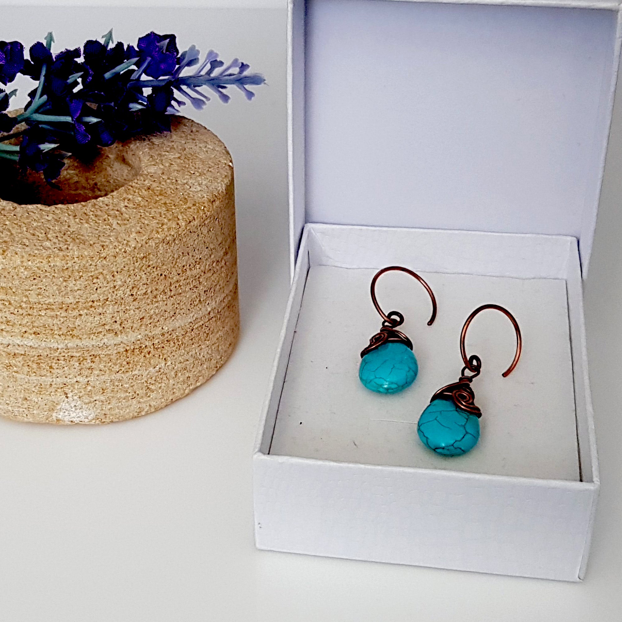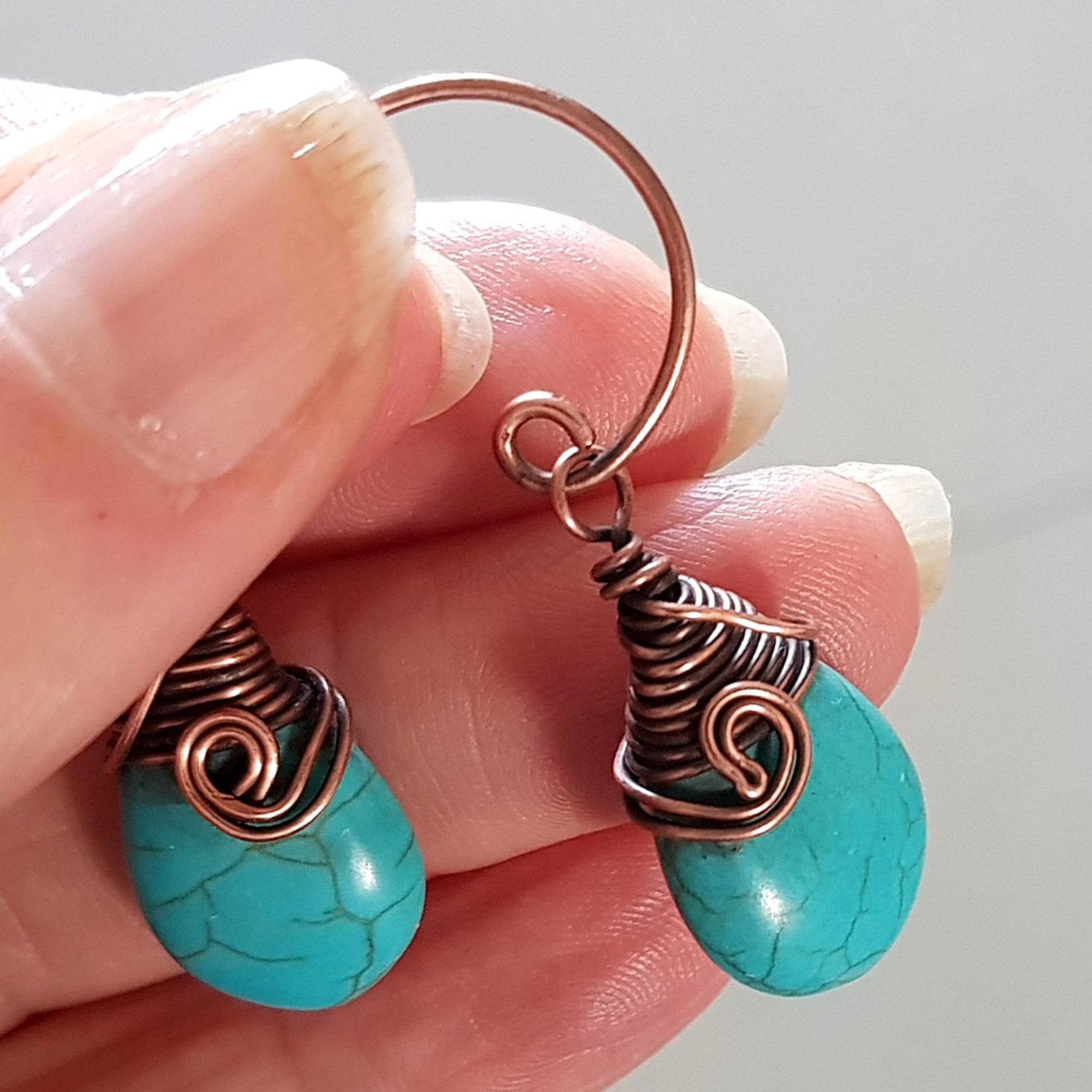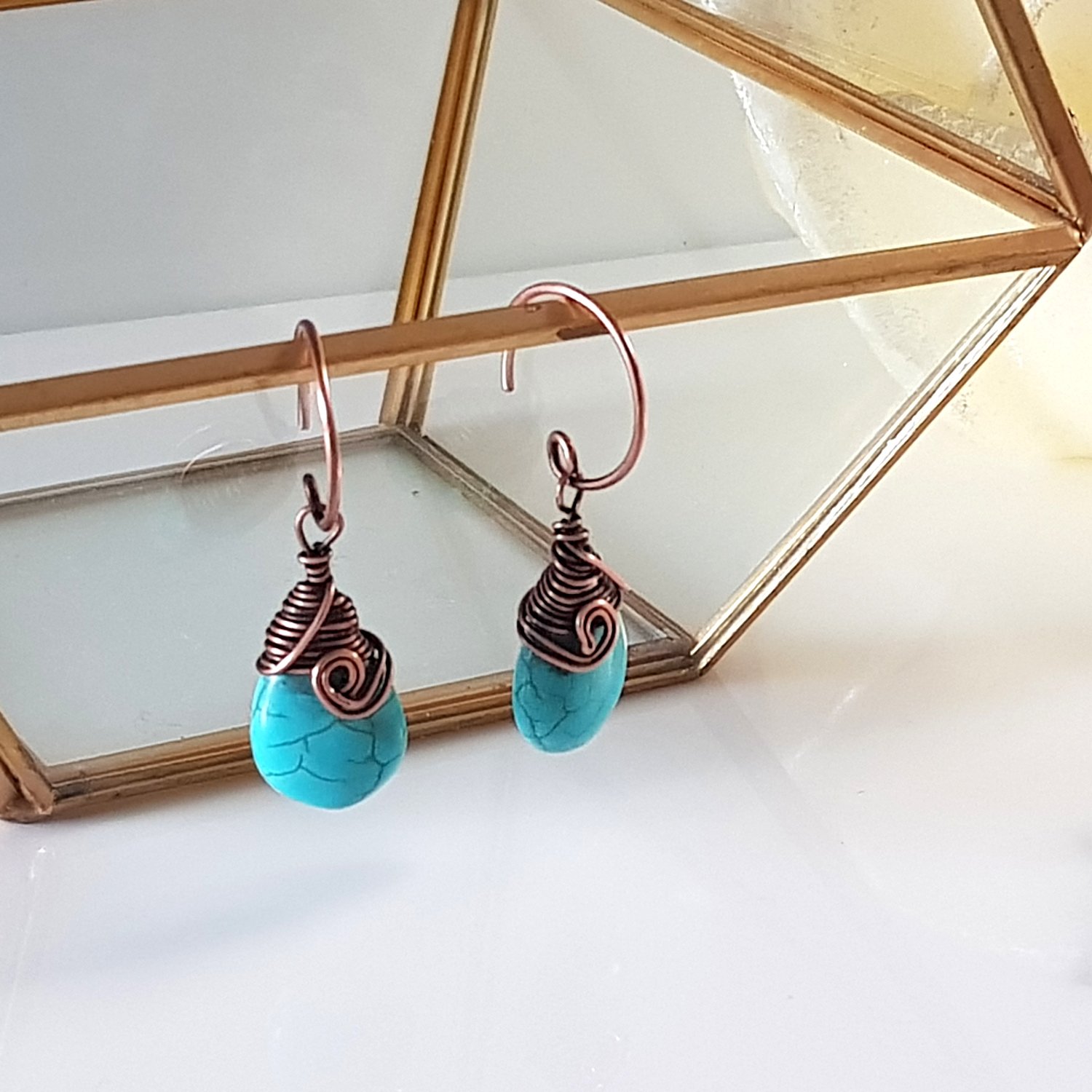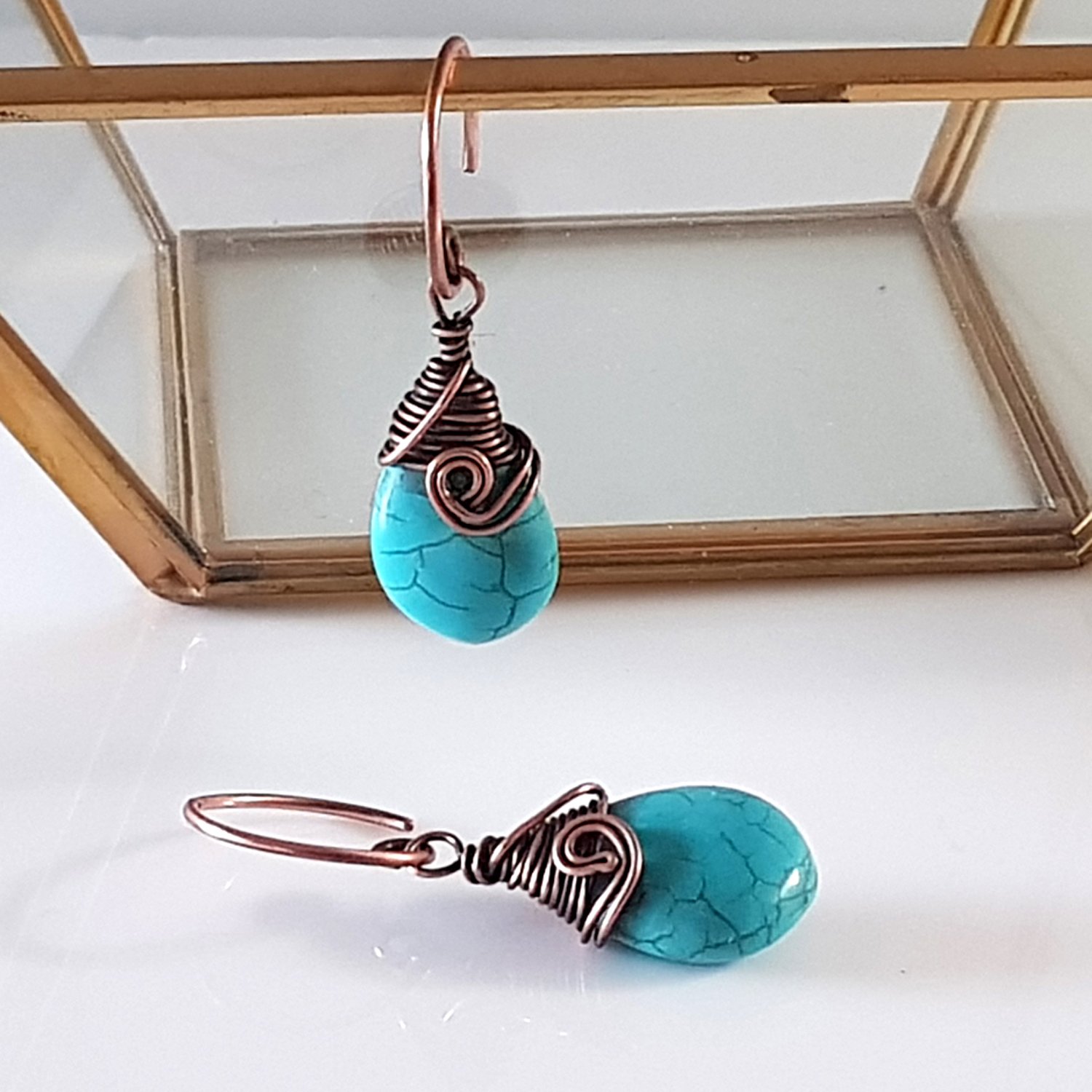 Each pair of earrings features a teardrop-shaped howlite stone, known for its calming properties and beautiful turquoise hue. The howlite is expertly wrapped with copper wire at the top, adding a touch of sophistication and warmth. The design is completed with a copper swivel at the front, ensuring that the earrings hang beautifully and move gracefully with you.