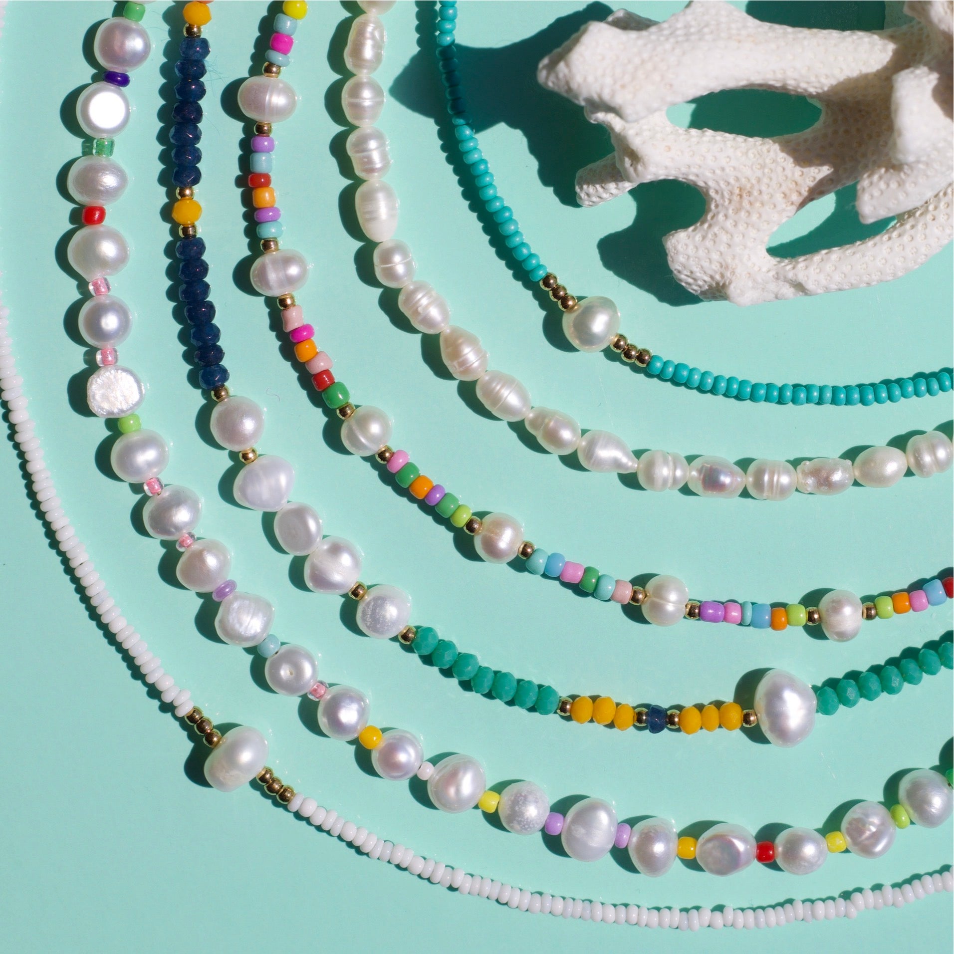 The necklace measures 40cm in length, with an additional 5cm extension, allowing for a customizable fit that can be adjusted to suit your neckline. The pearls are delicately sized at 3mm, while the glass beads range from 1-2mm, creating a harmonious balance of size and color that enhances the overall aesthetic of the necklace. This thoughtful design ensures that the necklace sits comfortably on your neck, making it suitable for all-day wear.