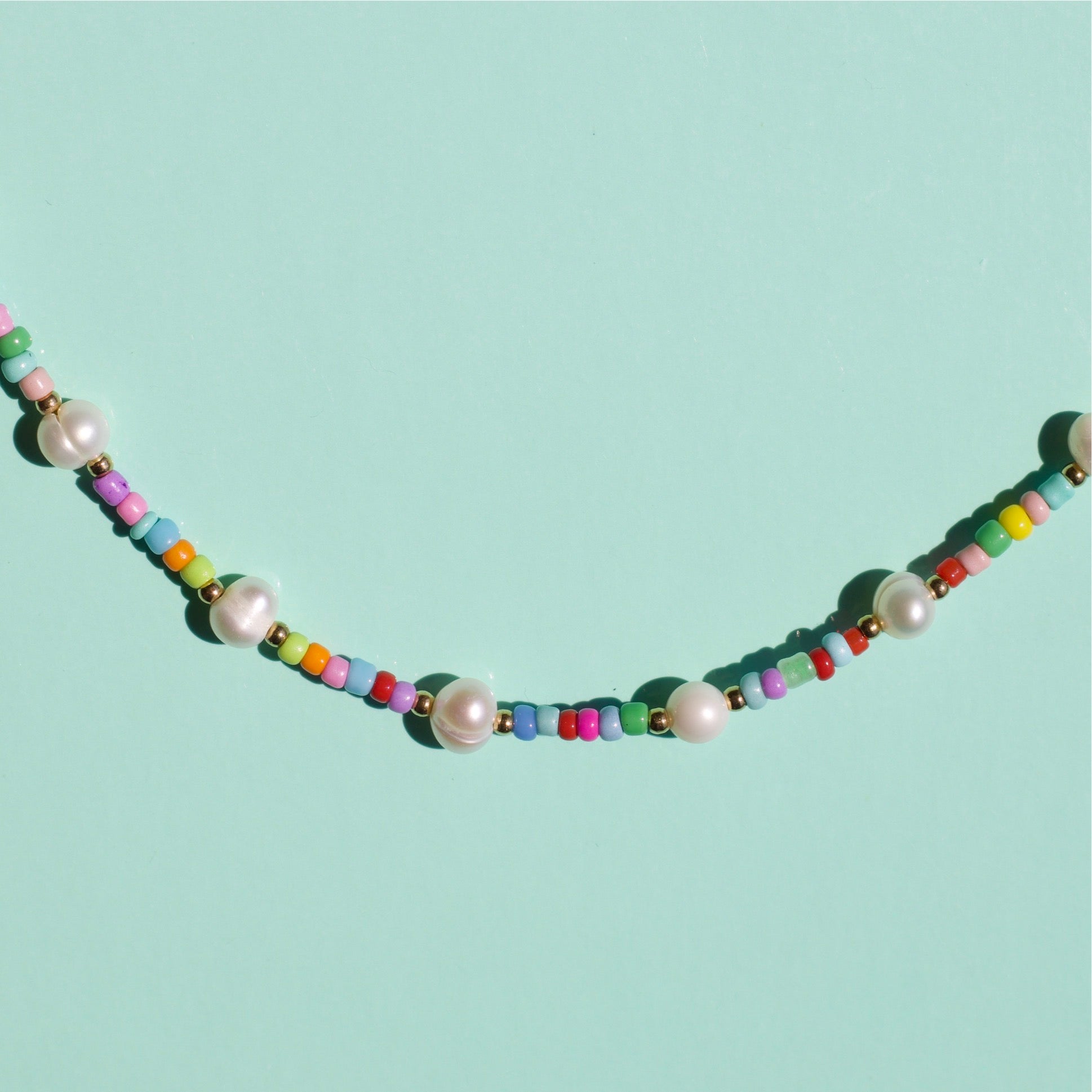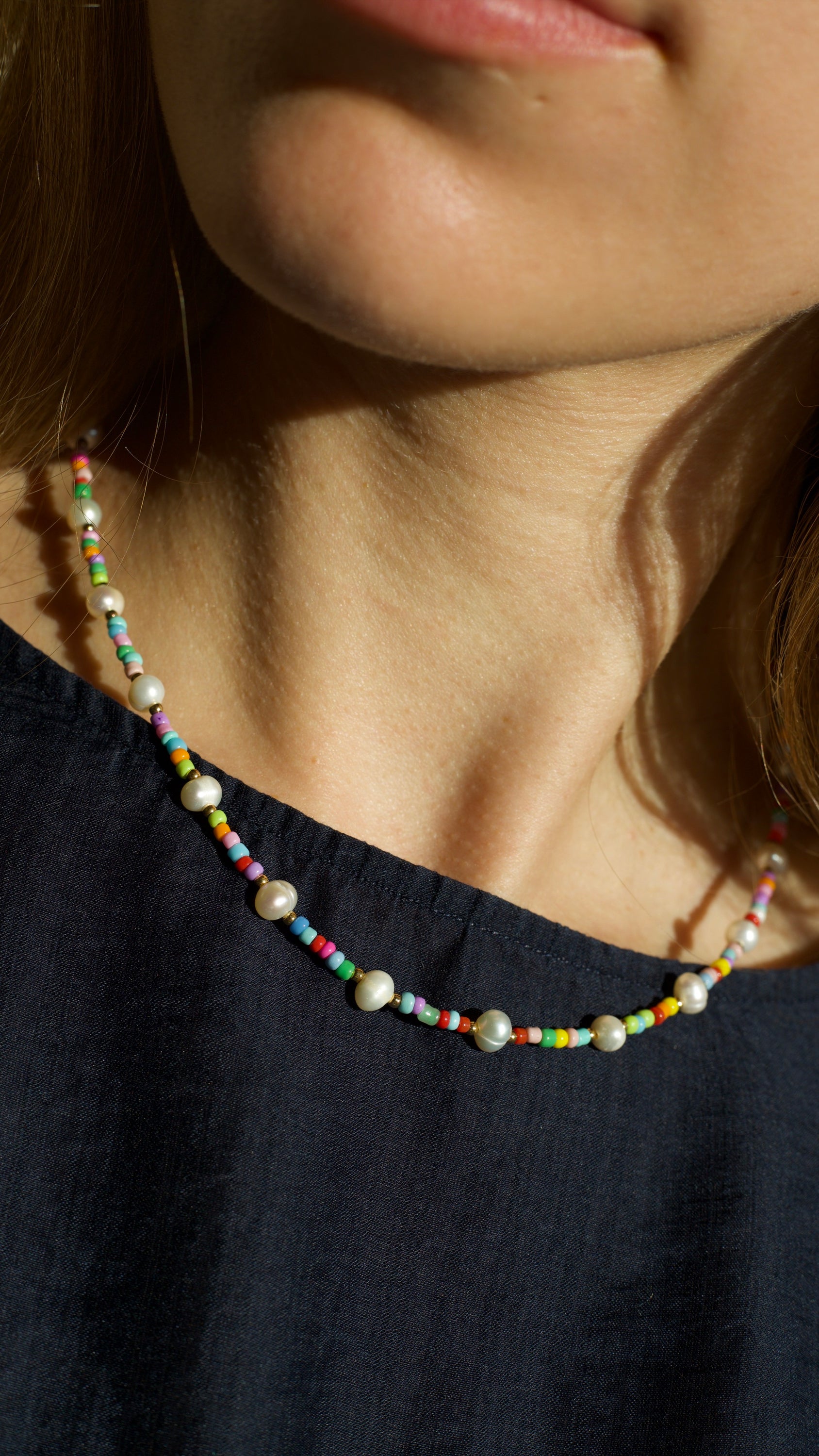 The Vaclav Rainbow Pearl Beaded Necklace is a breathtaking piece of jewelry that combines elegance and durability. This stunning necklace features a beautiful array of rainbow-colored glass beads and natural freshwater pearls, all elegantly attached to a gleaming gold chain. Whether you're dressing up for a special occasion or adding a touch of color to your everyday outfit, this necklace is the perfect accessory to elevate your style.