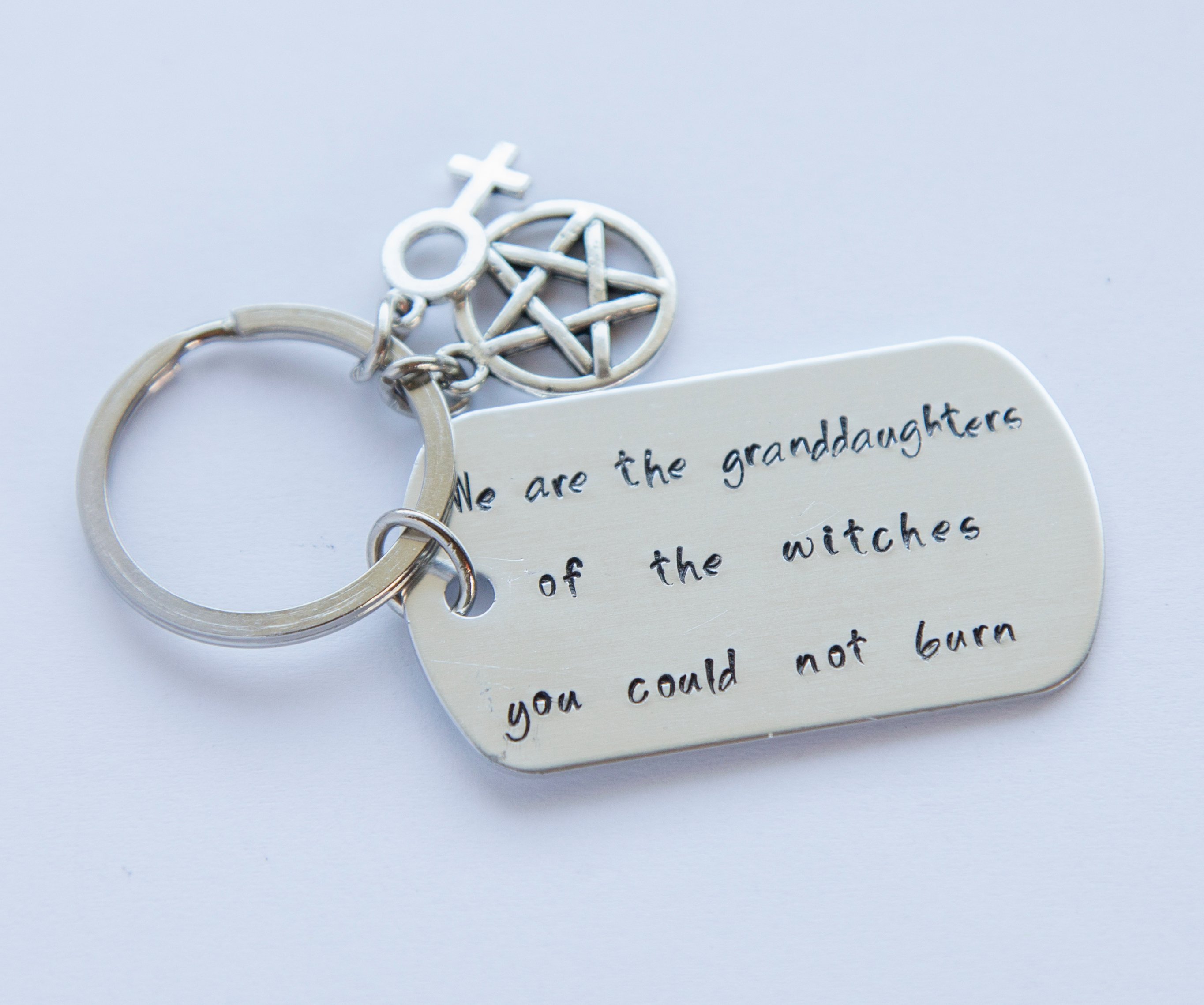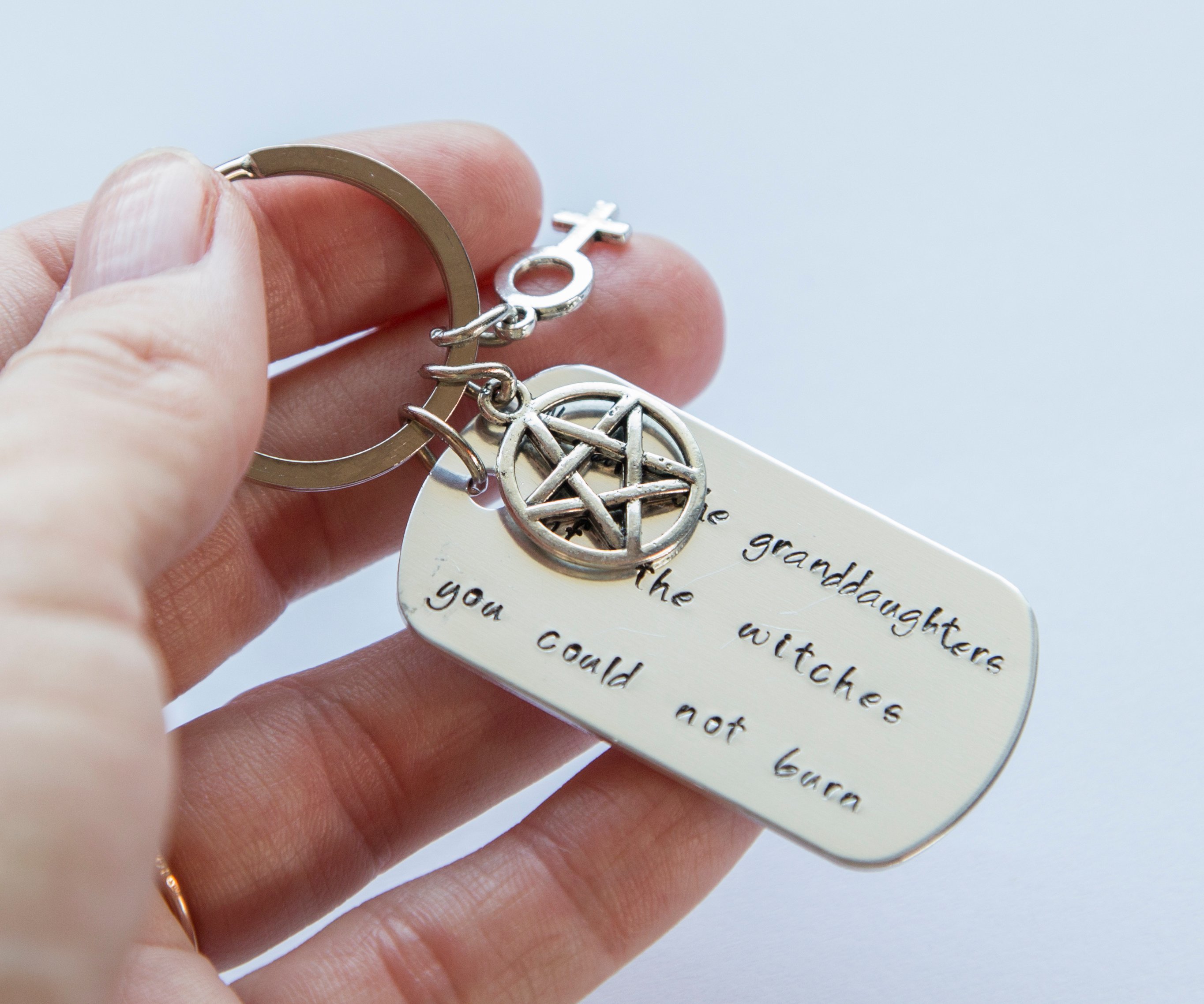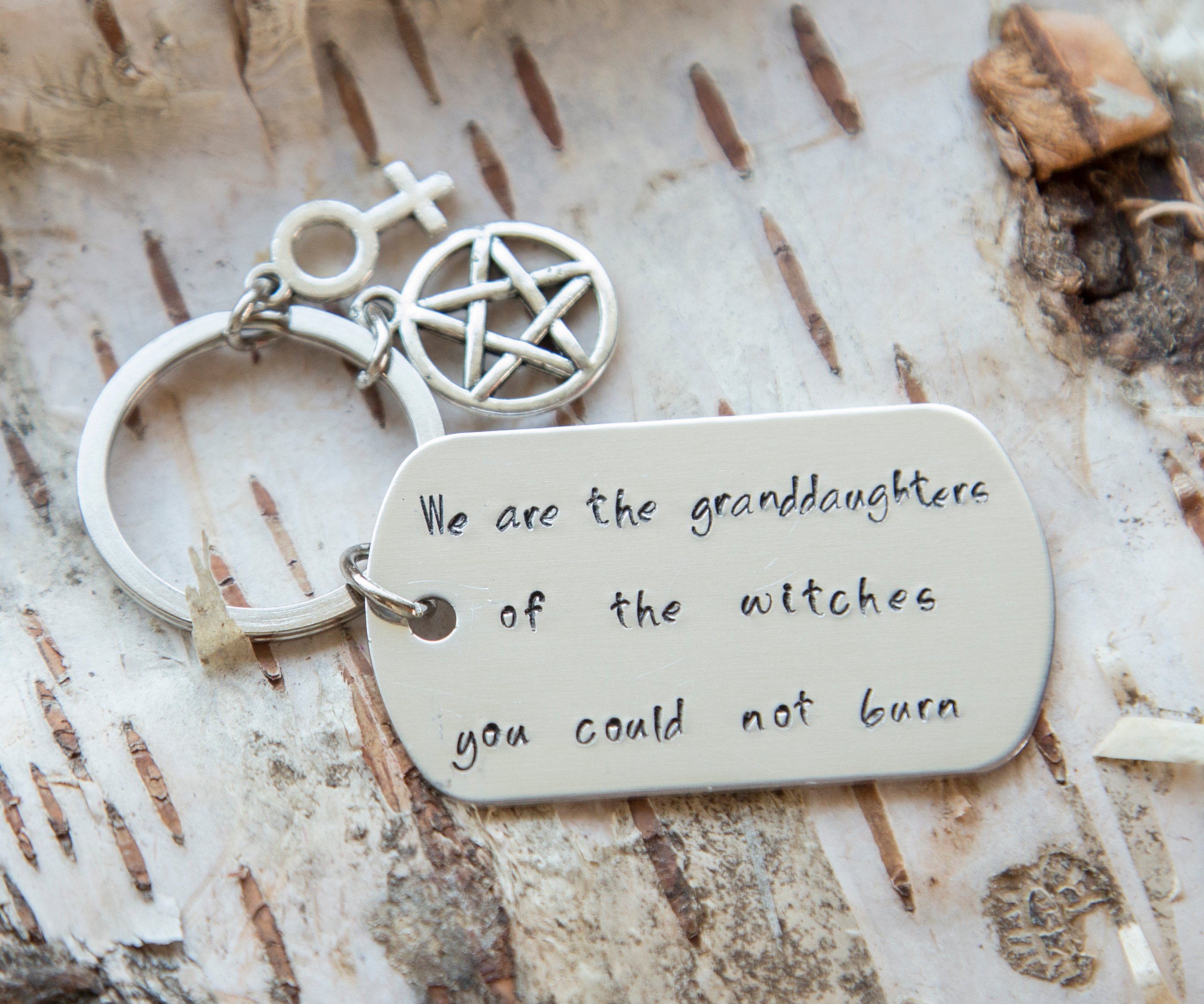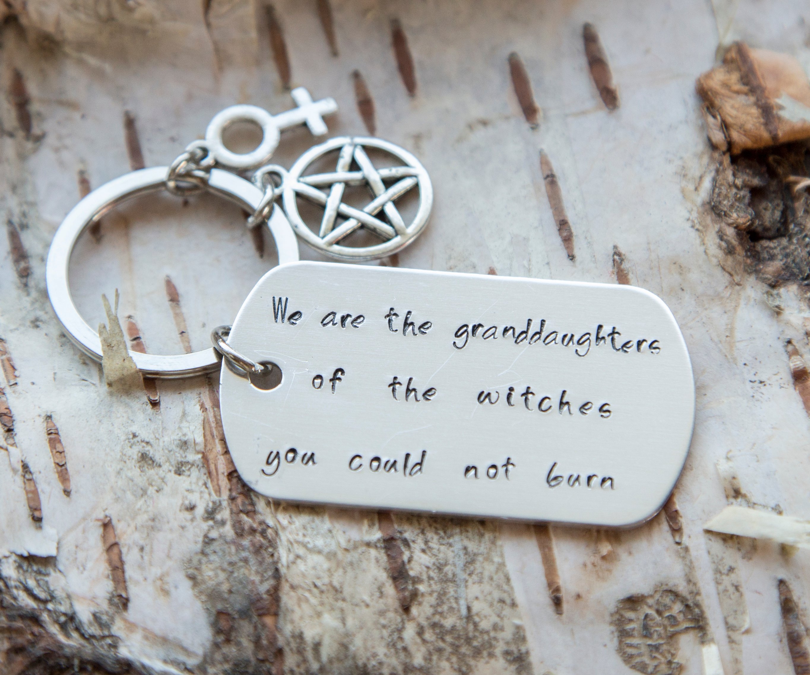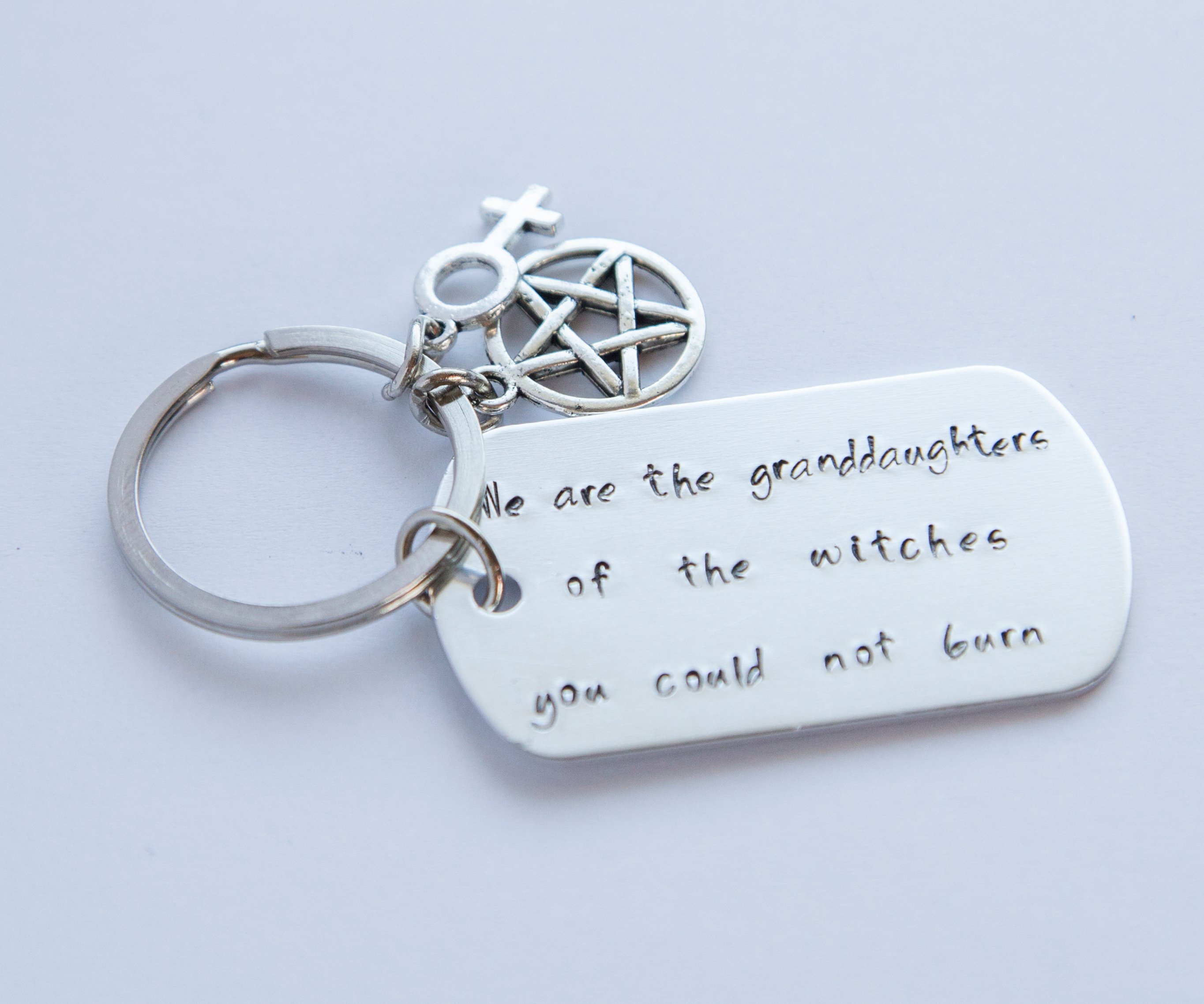 Introducing our exquisite keychain, featuring the powerful phrase, 'We are the granddaughters of the witches you could not burn.' This unique piece is not just a keyring; it’s a statement of empowerment and individuality. Crafted with care, this keychain is made from high-quality stainless steel, ensuring durability and longevity. The accompanying tag is made from lightweight aluminum, which is designed to resist tarnishing, making it a perfect accessory for everyday use.