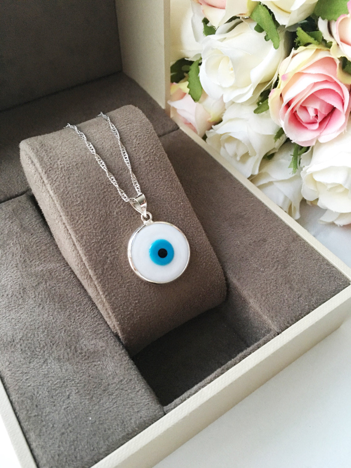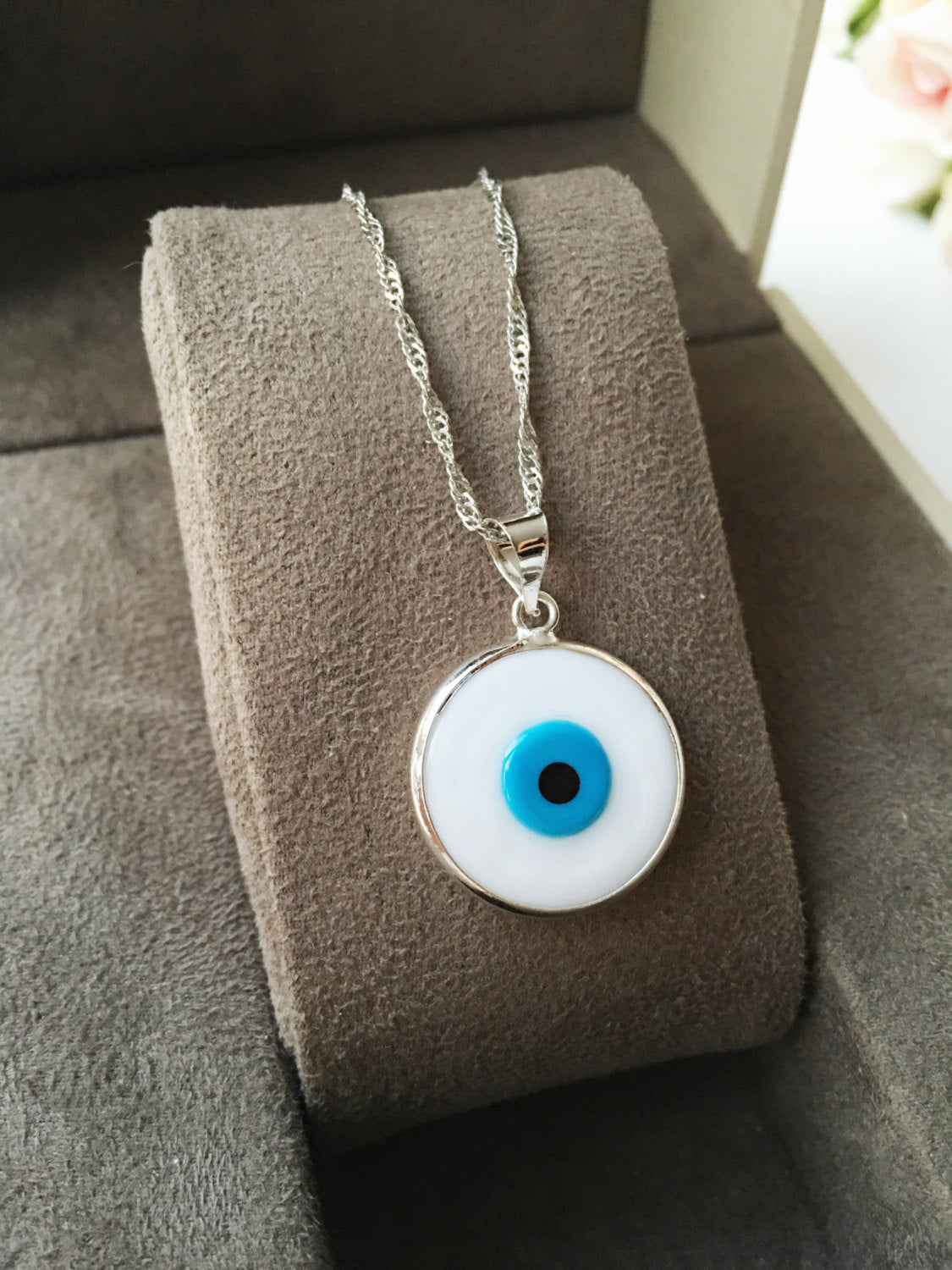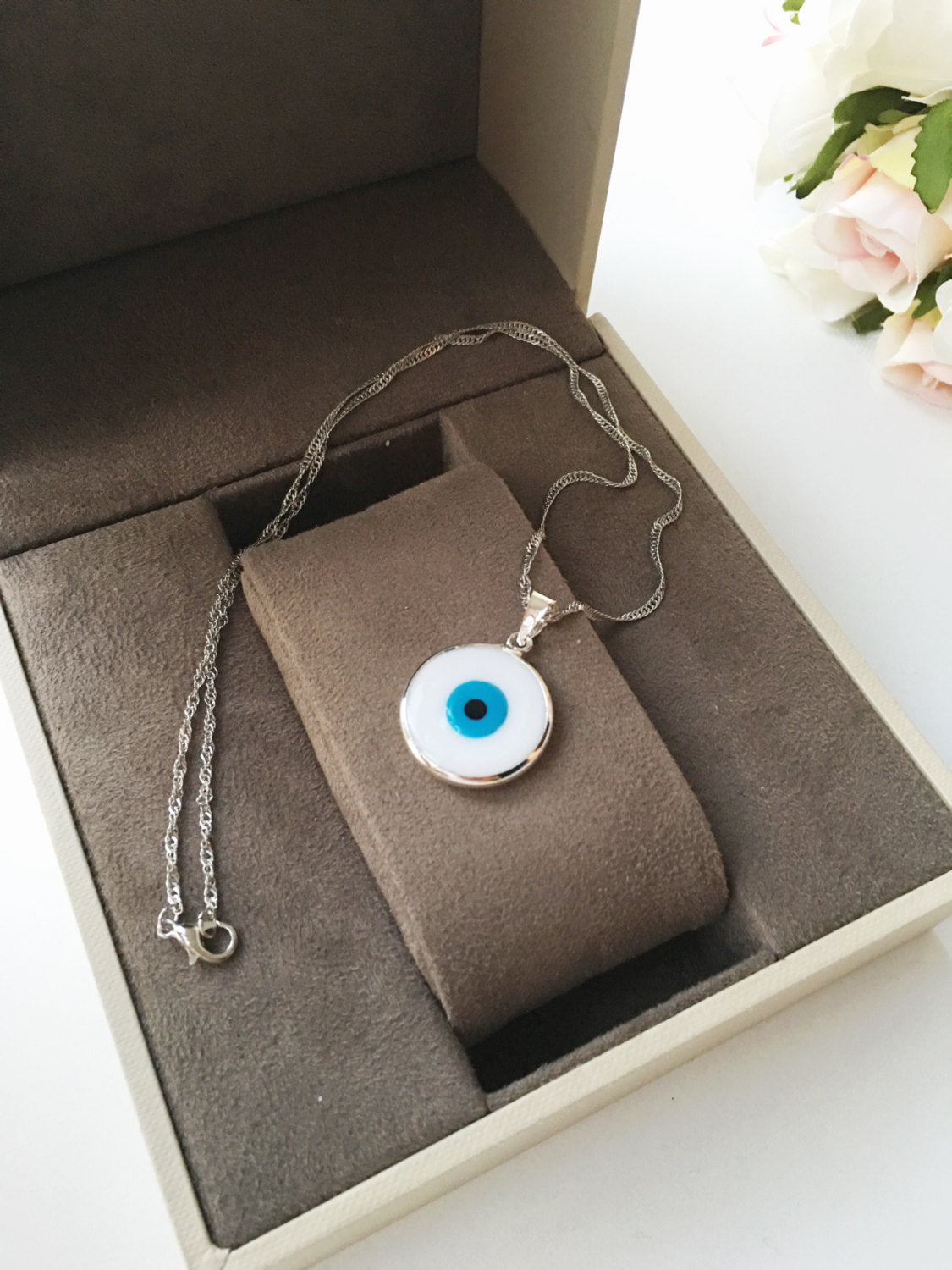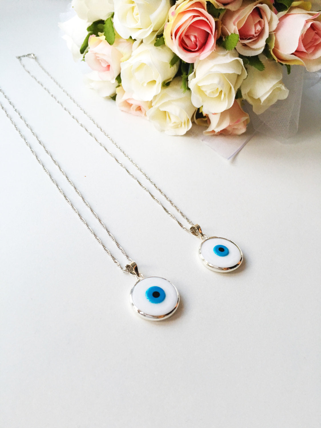 Dropship White Murano Evil Eye Necklace, Turkish Silver Necklace
