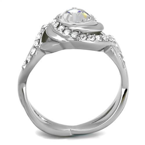 A beautiful women's stainless steel ring featuring clear synthetic crystals, showcasing a high-polished finish and elegant design.