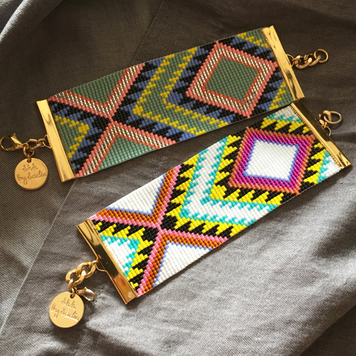 The bracelet is woven by Sadie using traditional bead loom techniques. Length approx 17cm.